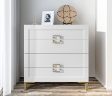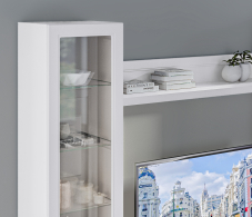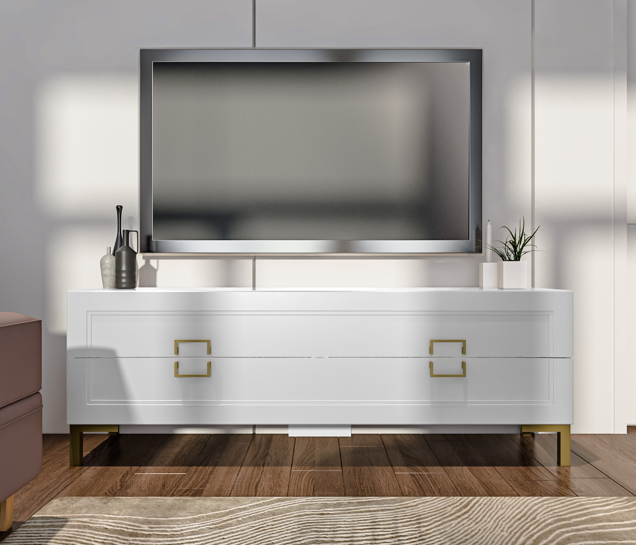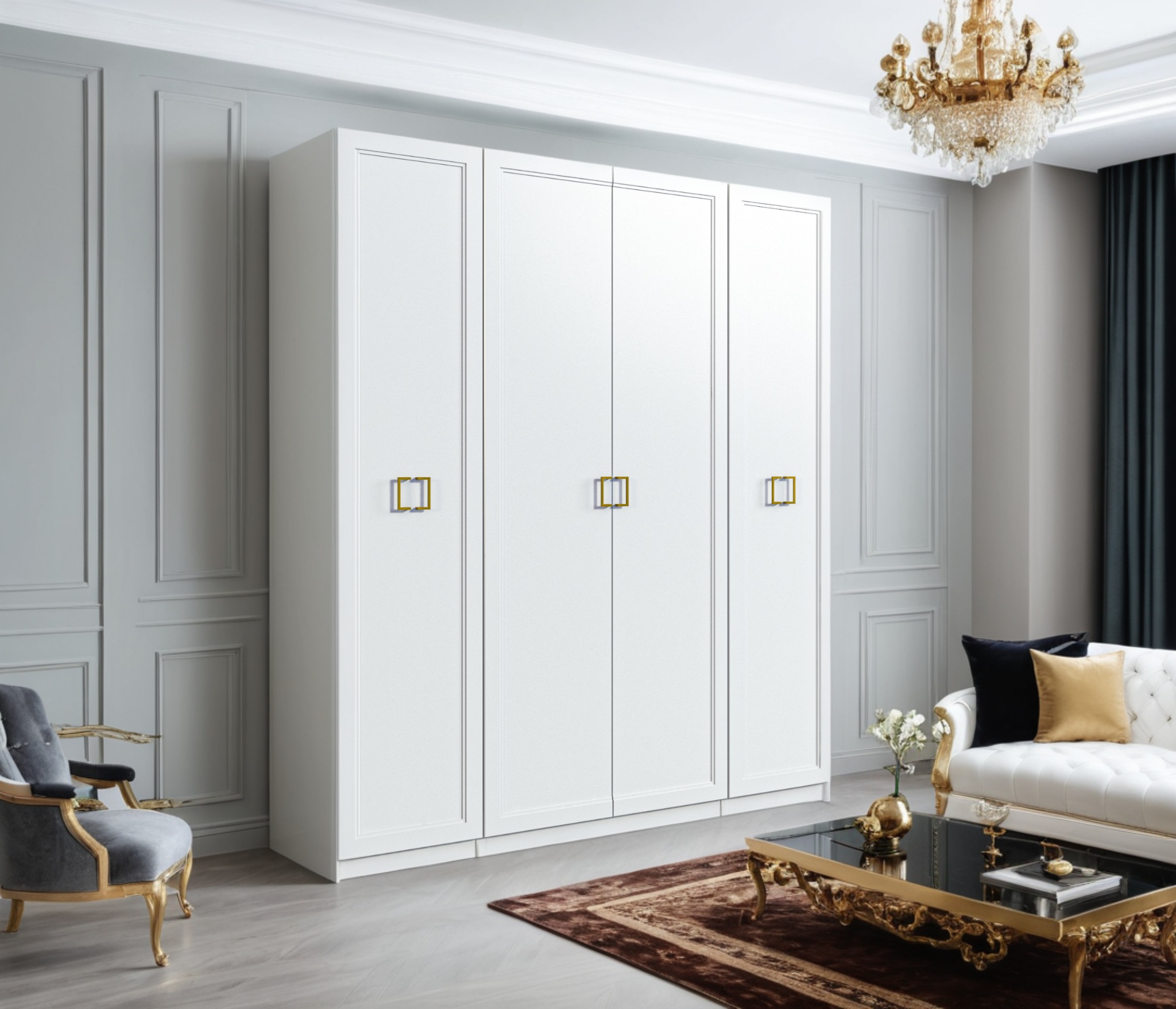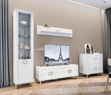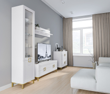• Стильный дизайн с рамочными фасадами придаёт гостиной изысканность и шарм, а золотые металлические ручки добавляют нотку роскоши и элегантности.