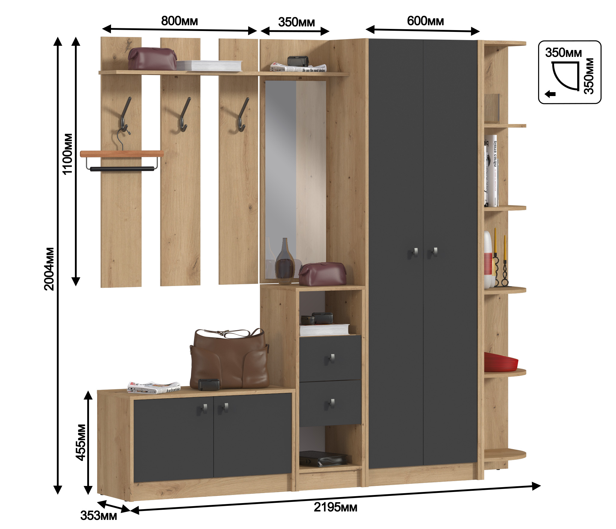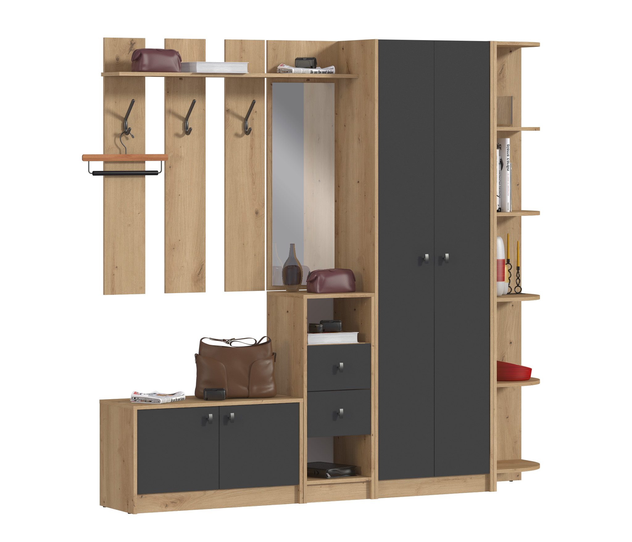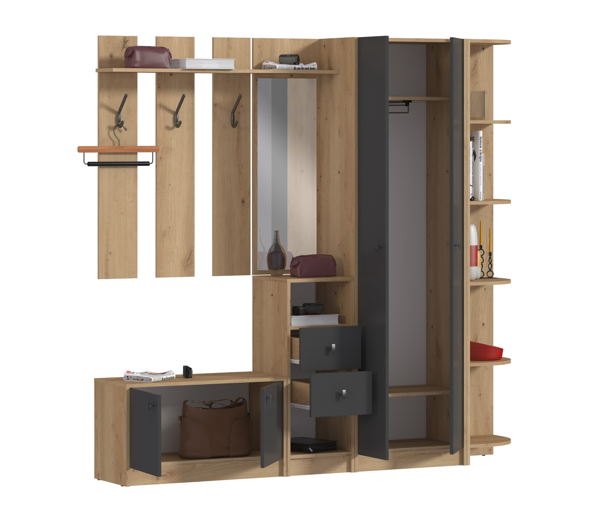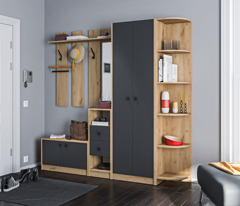 Модульная конструкция "Сидней" разработана для небольших помещений. Каждый модуль оптимизирован для экономии места, предлагая максимальную функциональность на минимальной площади. Вы можете создать свой собственный вариант прихожей, подбирая модули в соответствии с вашими потребностями и предпочтениями.