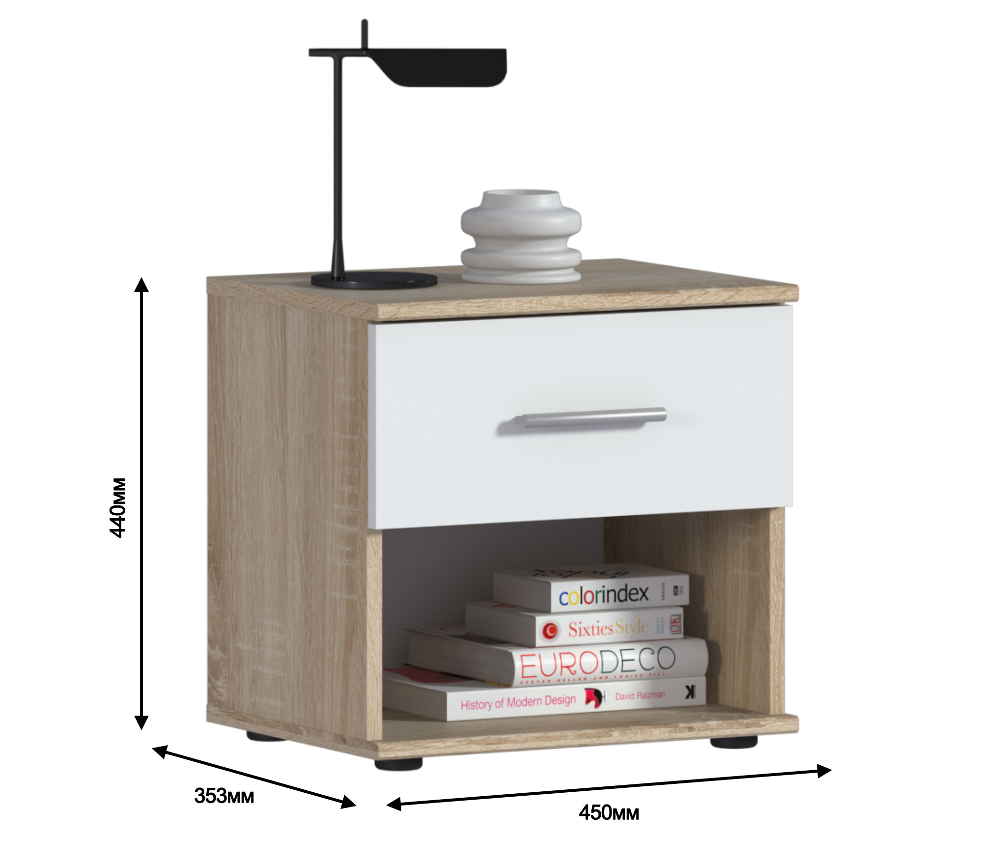 Габаритные размеры - ширина 45 см, высота 44 см, глубина 35 см. Под ящиком расположена открытая полка. Модель выполнена из КДСП. Благодаря корпусу с текстурой под дерево и белым фасадом тумба может с успехом использоваться и в классических, и в суперсовременных интерьерах.