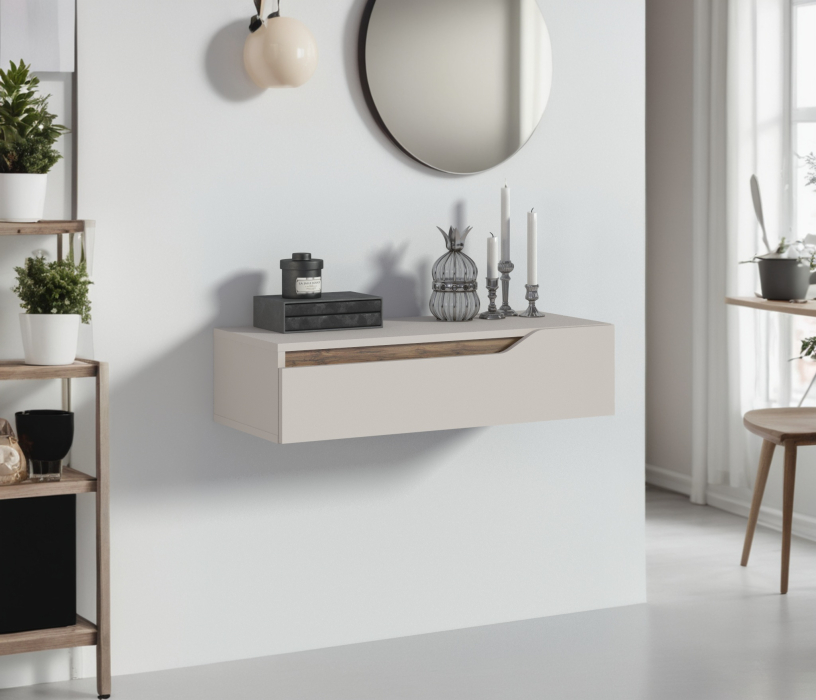 Особенностью данной модели являются плавные вырезы в фасадах, которые не только удобны для открывания, но и добавляют оригинальности. Внутри этих вырезов расположены вставки цвета Дуб вотан, что создает контраст и подчеркивает эстетику мебели.