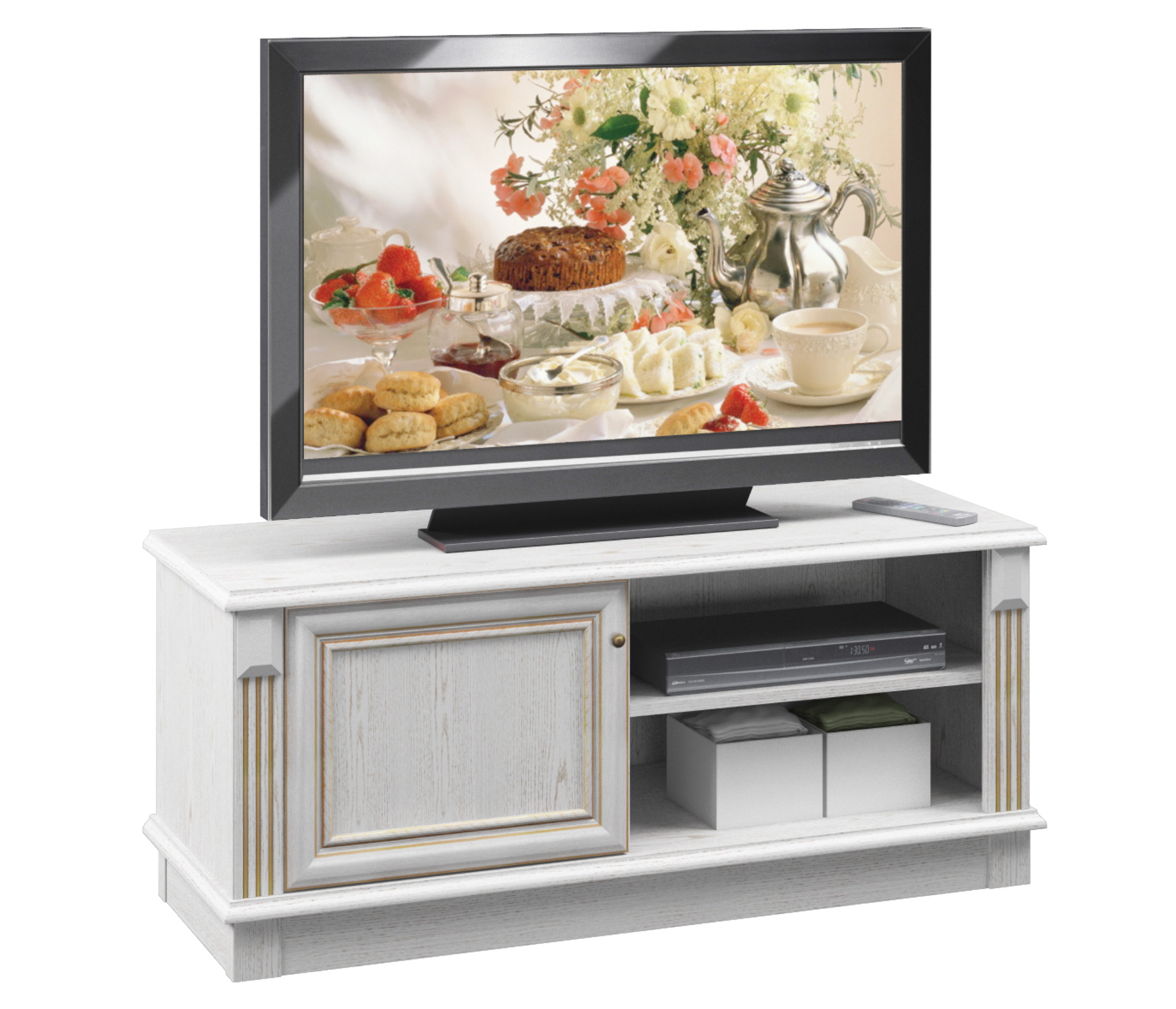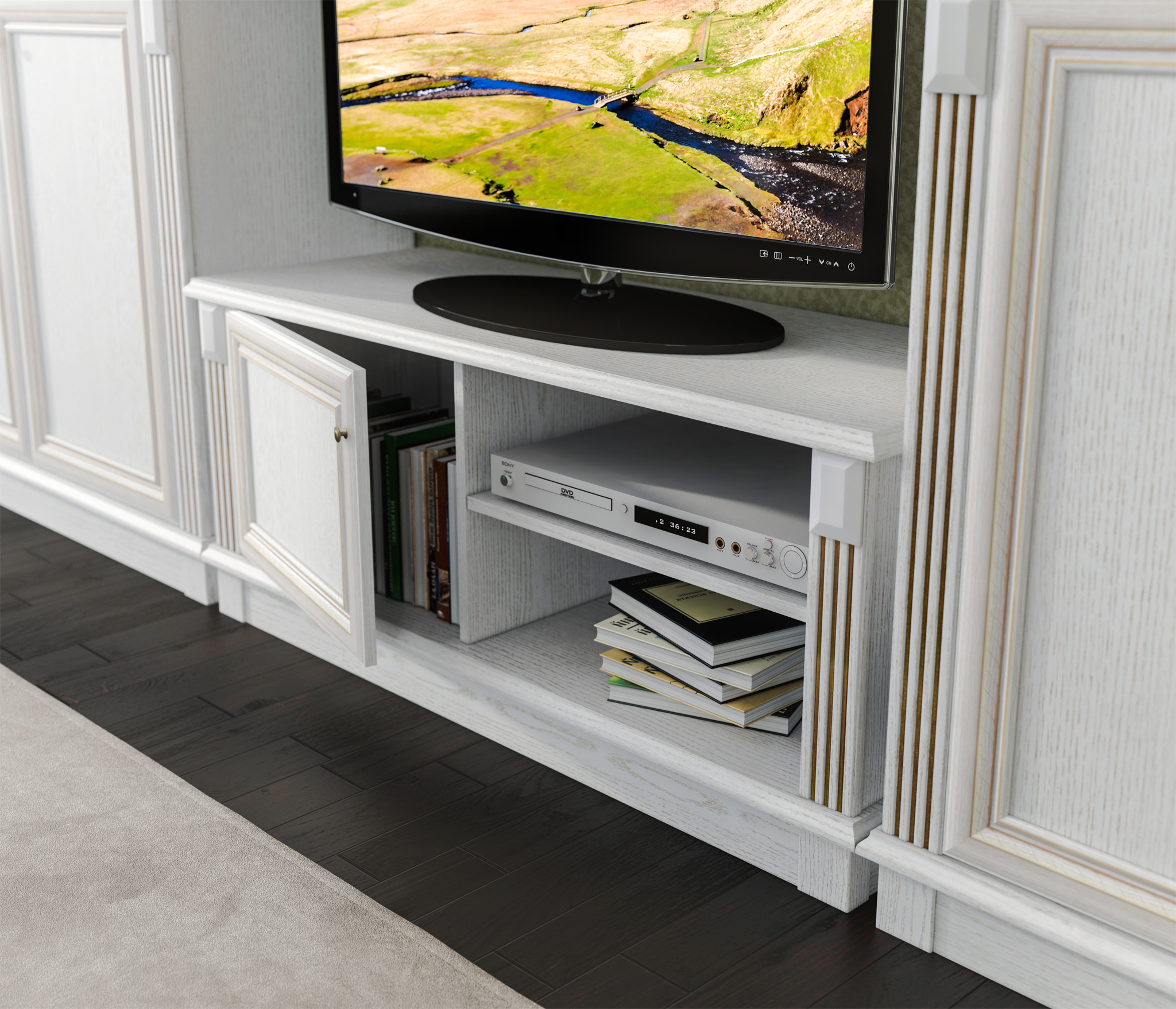 Тумба под телевизор Версаль СБ-2049 может быть стилизована в гарнитуре, а может быть автономным предметом мебели в спальне, прихожей, гостиной, кабинете или детской.
