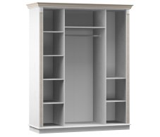 Размеры шкафа Версаль СБ-2051 нельзя назвать компактными – ширина 175 см, высота 218 и глубина 62 см. Визуально шкаф можно разделить на три отделения. Центральное отделение оснащено штангой для развешивания вещей, верхней и нижней антресолями. Два симметричных отделения оснащены вместительными полками. Две центральные двери – зеркальные. Изделие имеет сдержанный благородный дизайн и является элементом модульной коллекции Версаль. Корпус шкафа выполнен из КДСП, фасады - из МДФ. Светлый оттенок «Белый ясень» и стильные декоративные элементы - карниз-корона и пилястры - придают шик и винтажность данной модели.