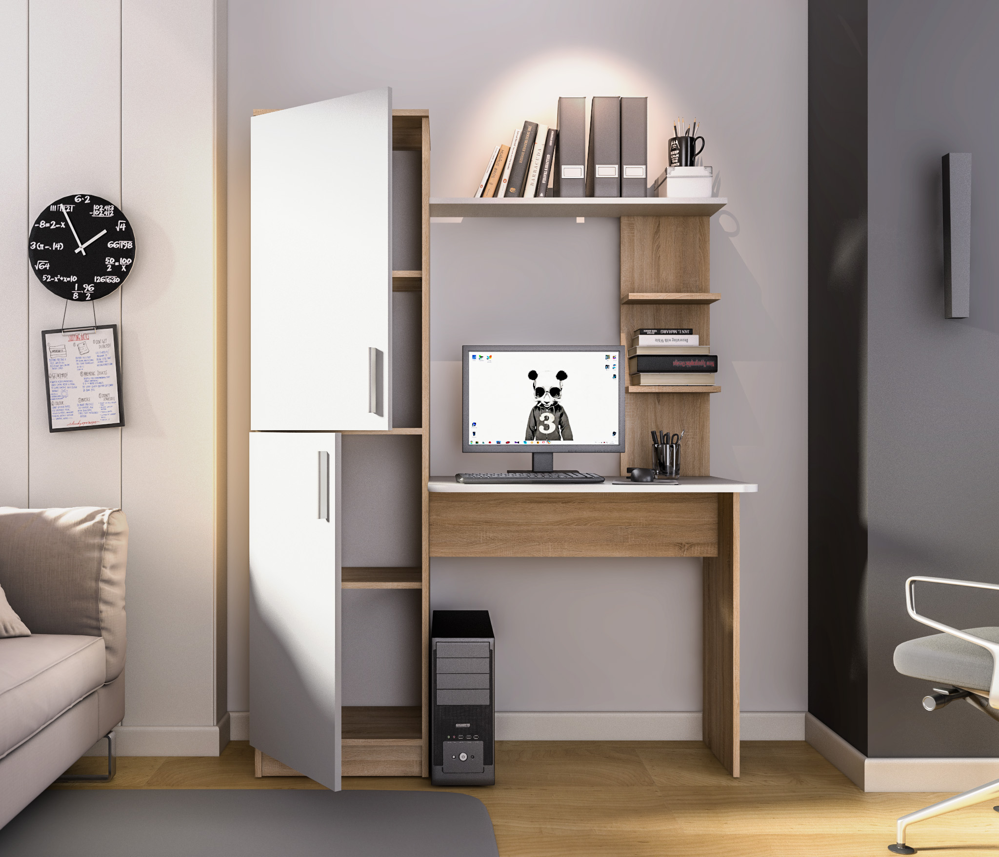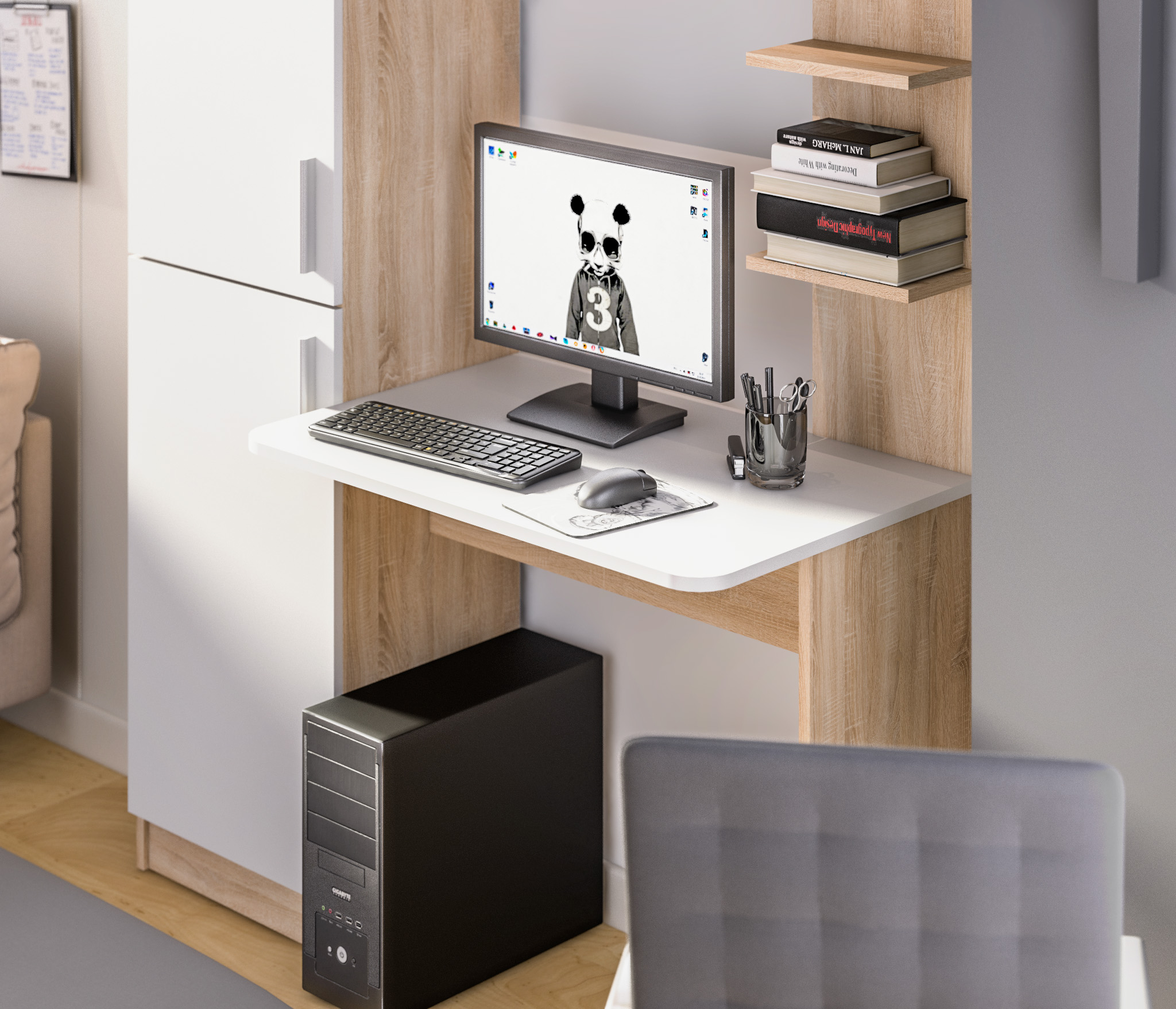 Стеллаж со столом "Тесса" - прекрасное решение для организации рабочего места в комнате ребенка или для домашнего офиса. Широкое рабочее место, полочки для памятных аксессуаров и закрытый шкаф для учебников и тетрадей.