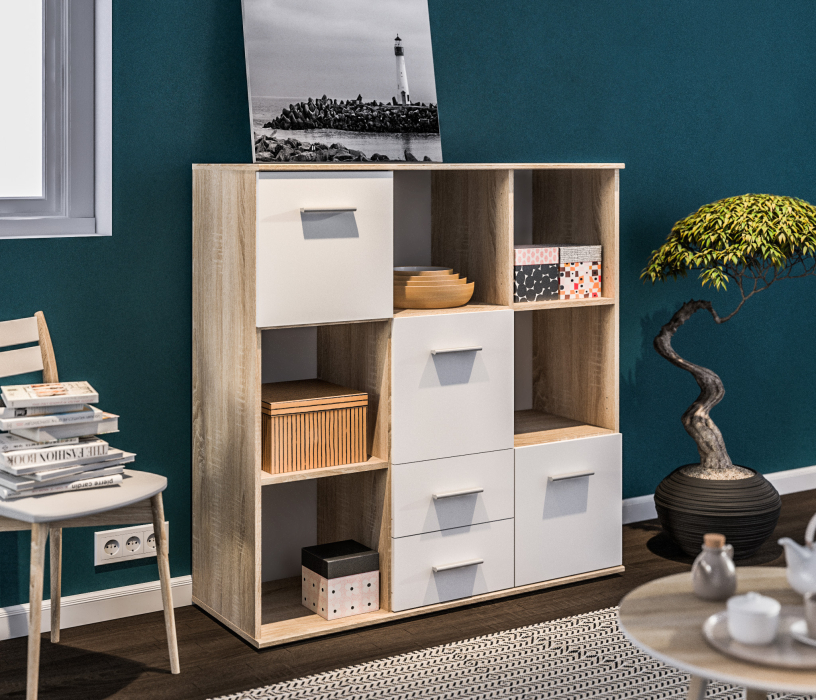 Модель производится из современного материала КДСП. Отделка комбинированная – корпус в цвете «Дуб Сонома», фасадные поверхности белые.