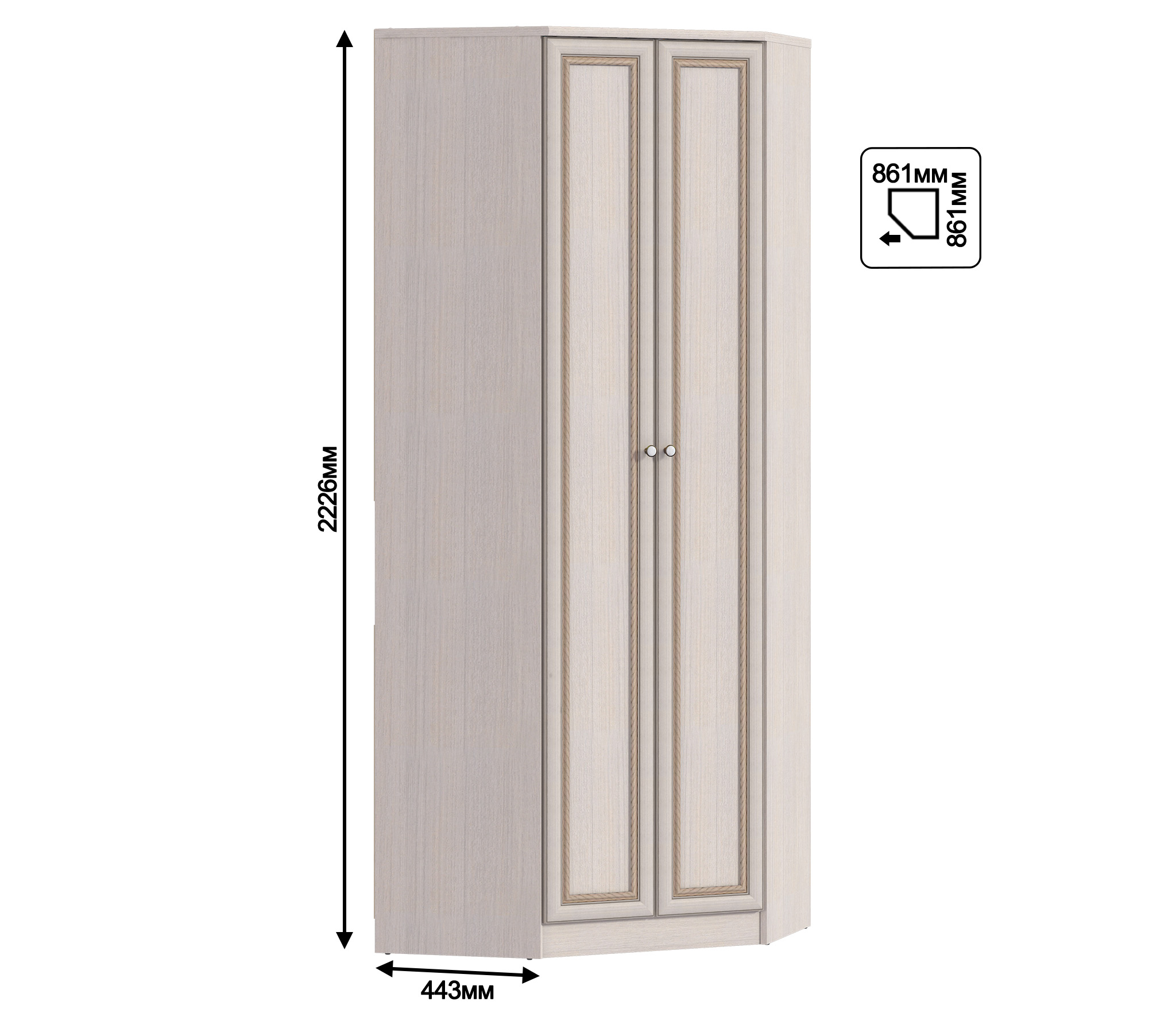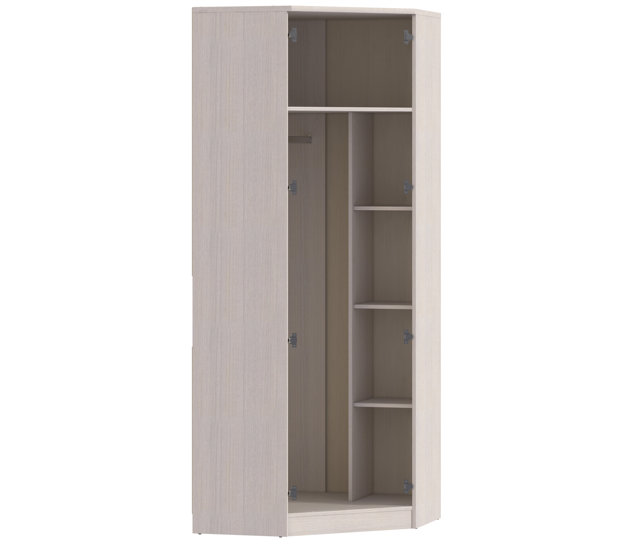 Двухдверный угловой шкаф Грация СБ-2855 предназначен для хранения одежды. Шкаф органично впишется в интерьер спальни, прихожей, кабинета или детской.