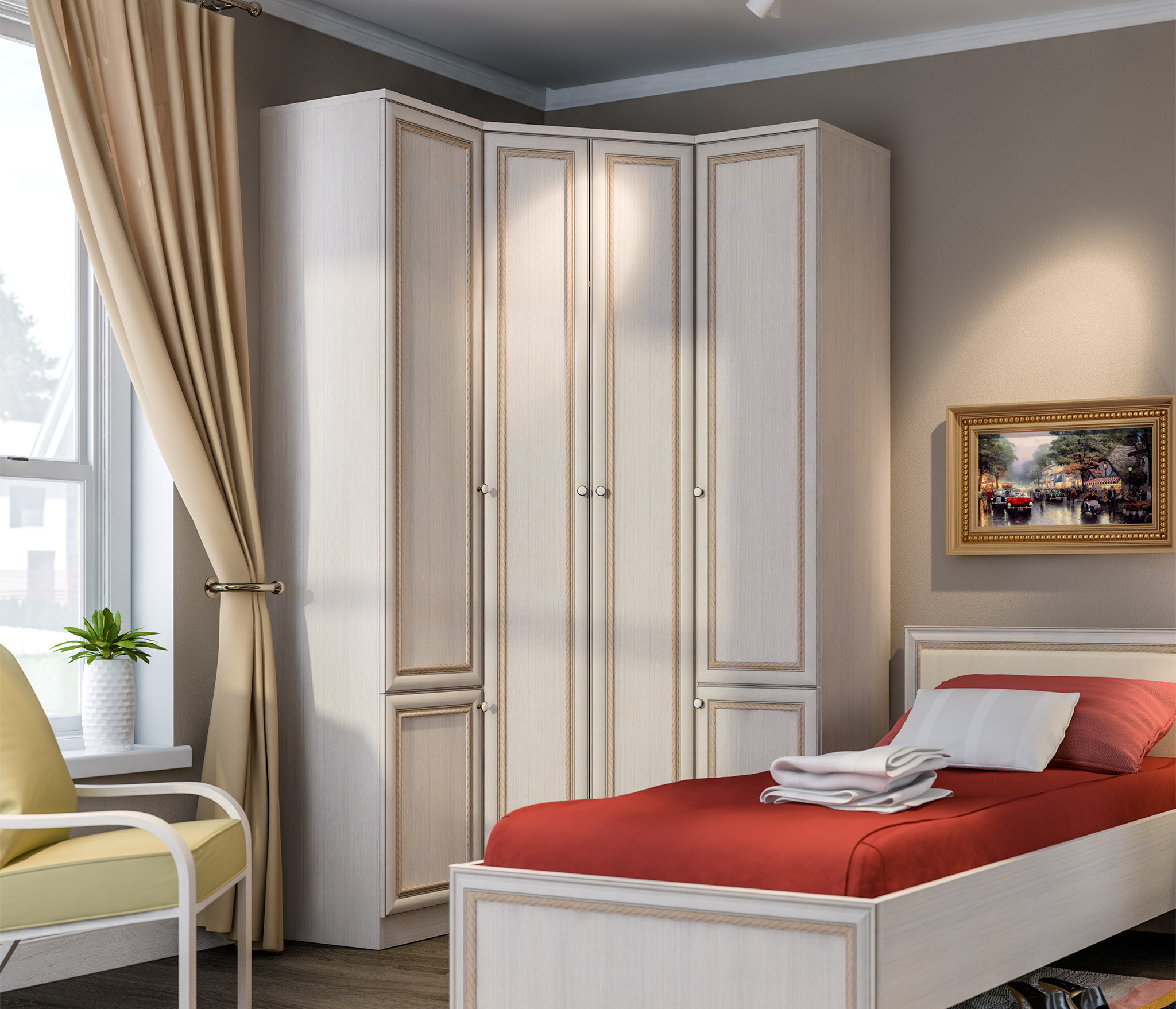 Лаконичный дизайн, продуманная фурнитура, прочные крепёжные механизмы говорят о достойном качестве углового шкафа Грация, который можно рассматривать как отдельный предмет интерьера, а можно стилизовать в гарнитур.