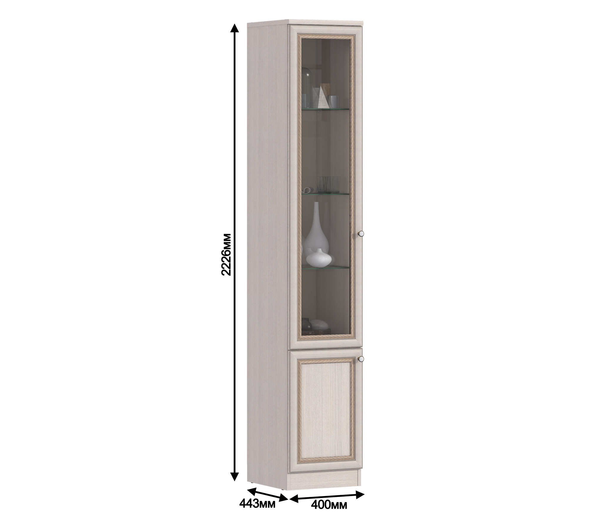При компактных размерах – ширина 39 см, высота 222 см и глубина 44 см - это довольно вместительная витрина, которая позволит решить вопросы, связанные с хранением памятных вещей. Визуально витрина разделена на два отделения – верхнее выставочное, находится за прозрачной, а нижнее - за обычной дверцей.