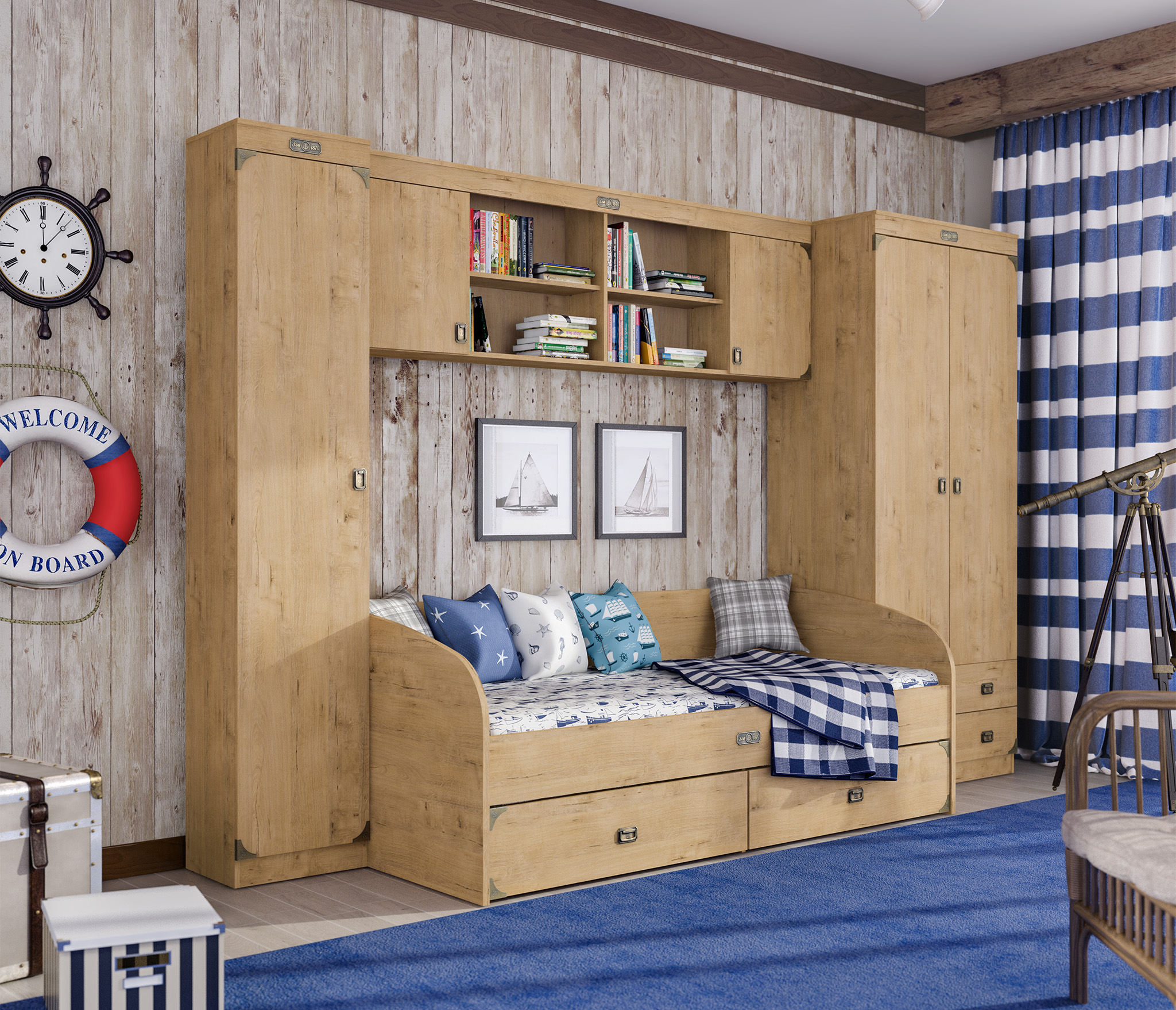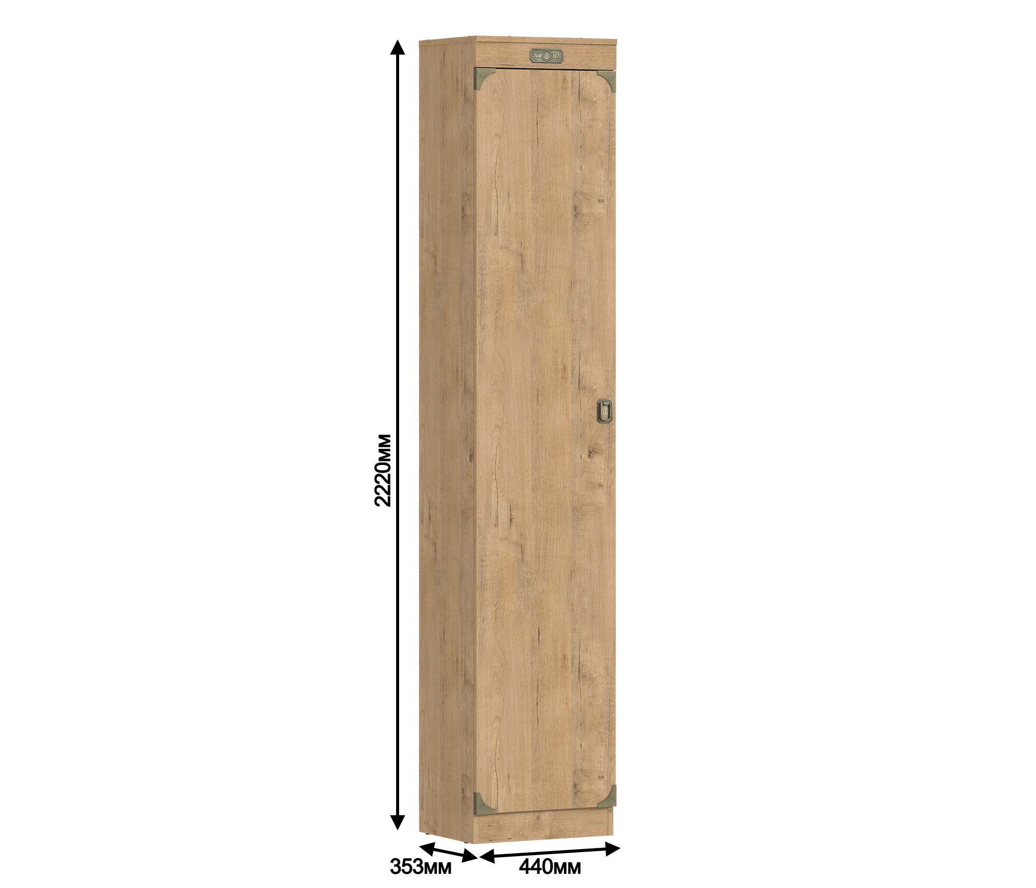 Габаритные размеры – ширина 44 см. высота 222 см, глубина 35 см. Шкаф Фрегат выполнен в морской стилистике из прочного современного КДСП. Цвет отделки «Дуб Бунратти».Шкаф может использоваться как отдельный предмет мебели, так и в сочетании с другими элементами из коллекции Фрегат.