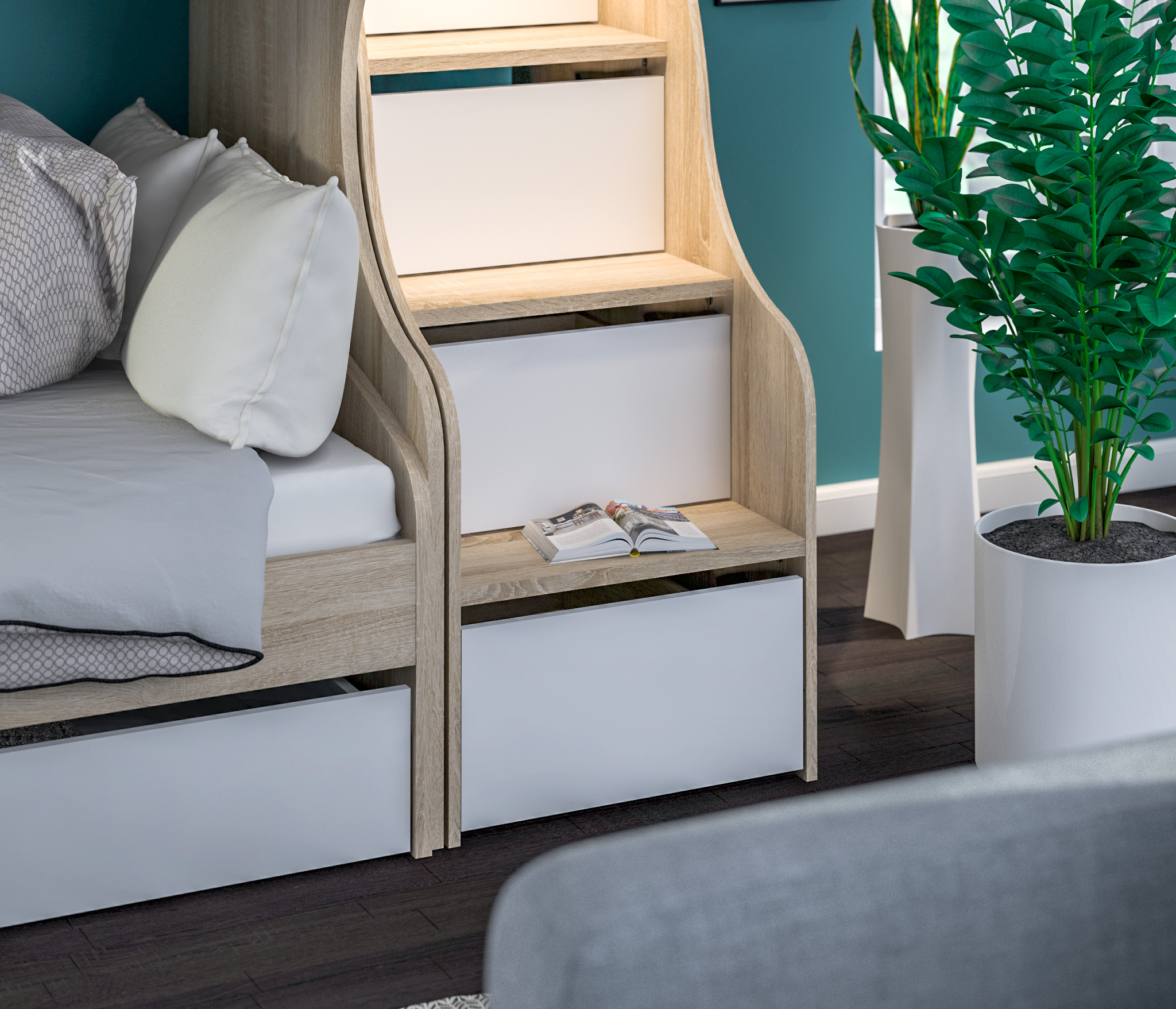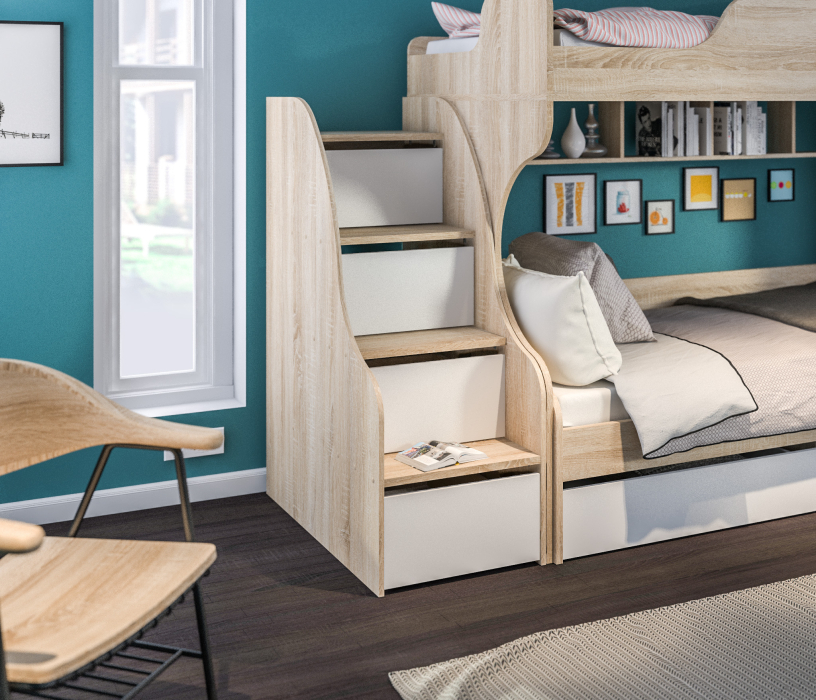 Приставная лестница для кровати служит дополнительным элементом к кровати-чердаку Мамбо СБ-2871. Ящики можно использовать для хранения.