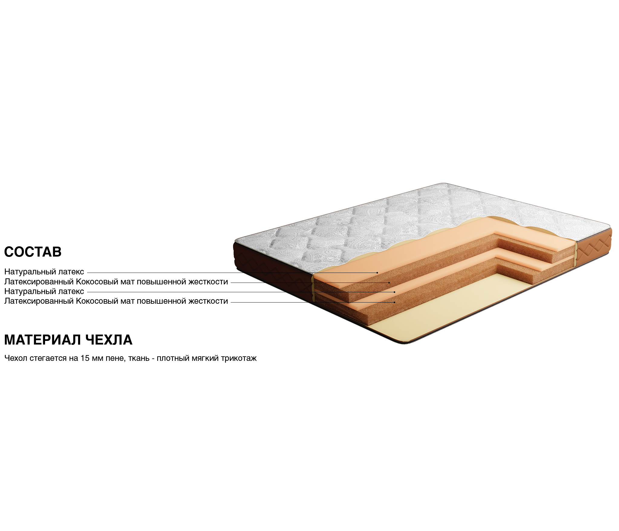 Это жесткий прочный и практически вечный матрас, в основе которого лежит комбинация латексированных кокосовых матов и натурального латекса. Благодаря этим матрасный блок можно считать полностью натуральным. Такой матрас подойдет людям с весом выше среднего или тем кто, предпочитает спать исключительно на жестких и ровных поверхностях. Матрас сохранит свою форму в течение многих лет. Чехол матраса разработан итальянскими дизайнерами, ткань очень приятная на ощупь, но при этом ее достаточно легко чистить, она не впитывает запахи и абсолютно гипоаллергенна. Обращаем ваше внимание, что матрас отвечает за здоровье нижнего и среднего отделов позвоночника, а за шейный отдел отвечает правильно подобранная ортопедическая подушка. Рекомендуем использование матраса с защитным чехлом аквастоп.