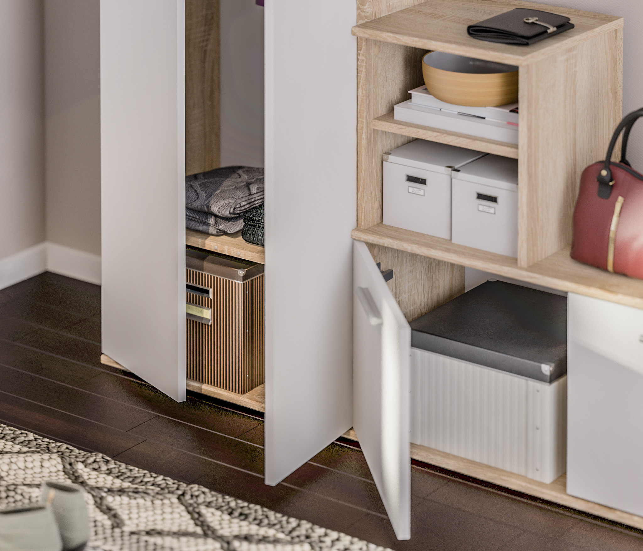 Выполнен шкаф из современного и качественного материала КДСП. Внешняя отделка комбинированная – корпус в цвете «Дуб Сонома», фасады чисто белые.