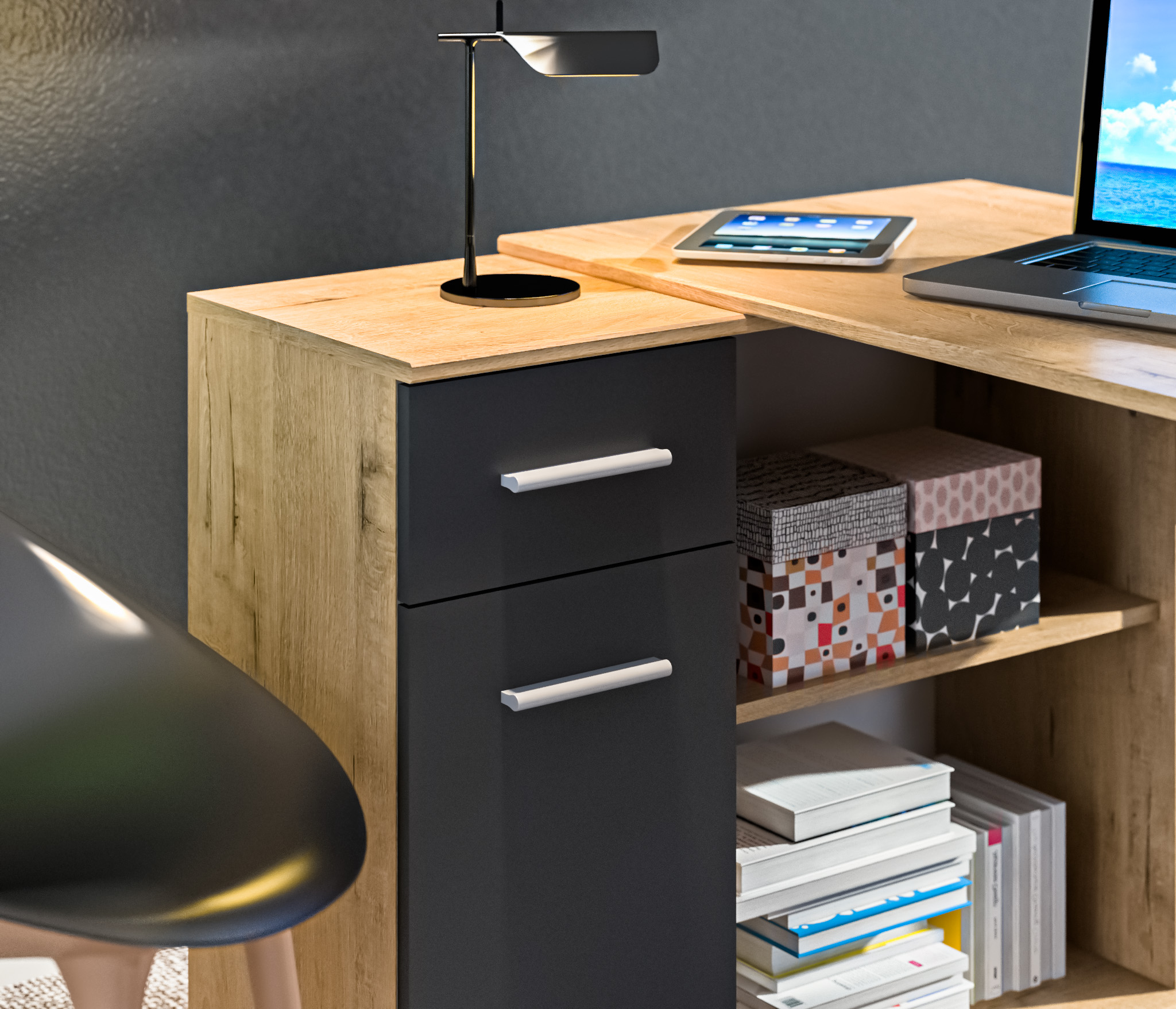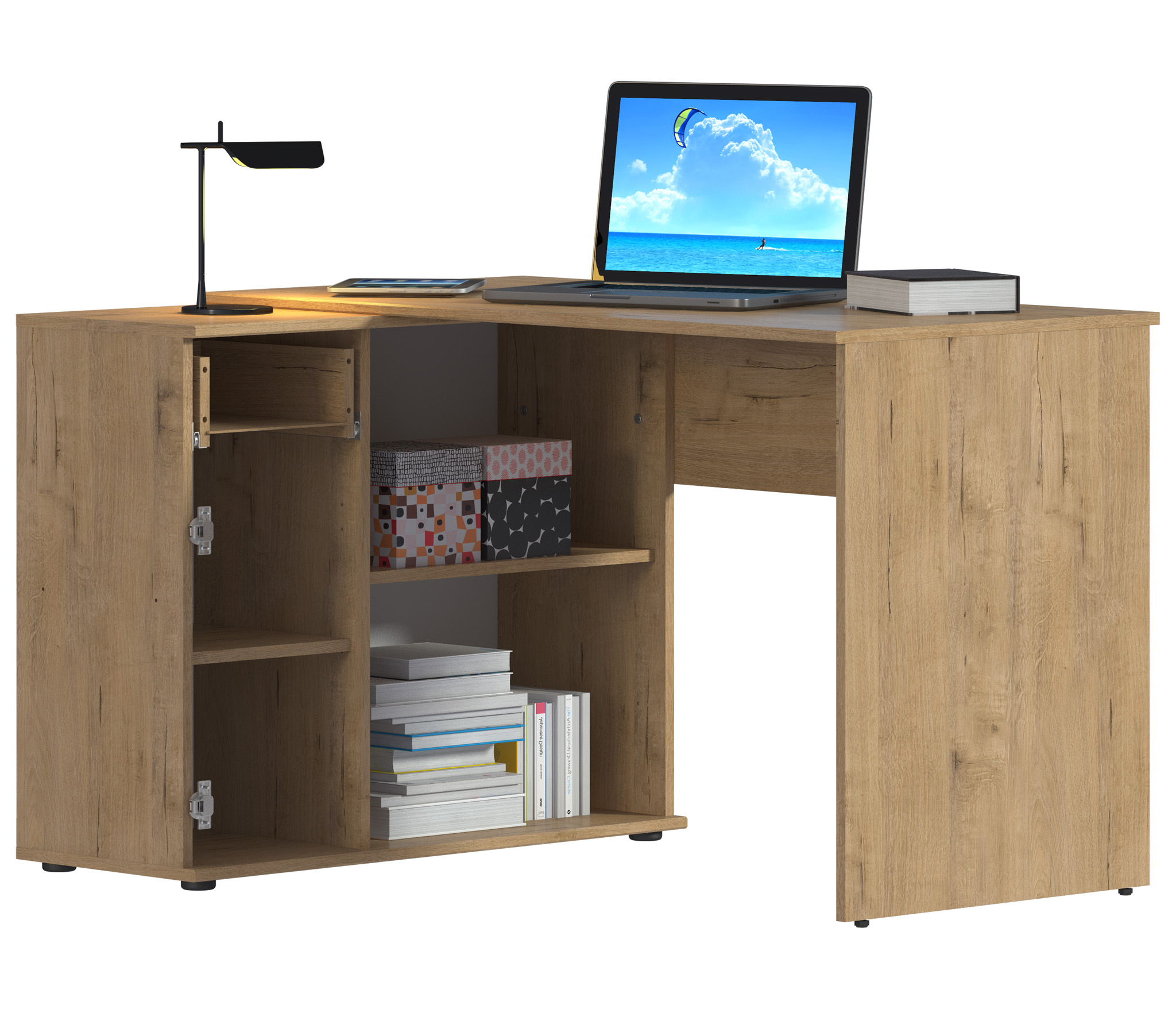 Стол-тумба Мамбо СБ-2886 – продуманное и комфортное рабочее место. Идеальный вариант, если есть необходимость в двух письменных столах. Простая конструкция, светлый оттенок, лаконичный угловой дизайн позволяют без проблем разместить стол-тумбу Мамбо в детской, комнате школьника или студента, а также в кабинете. Габаритные размеры – ширина 119 см, высота 74 см и глубина 91 см. Под рабочей поверхностью расположена тумба с открытыми вместительными полками, а также выдвижной ящик и закрытое отделение с отдельной дверцей. Стол произведен из современного экологичного КДСП. Корпус и рабочая поверхность выполнены в цвете «Дуб Сонома», фасадные поверхности в Белом цвете. Возможен как левый, так и правый вариант сборки.