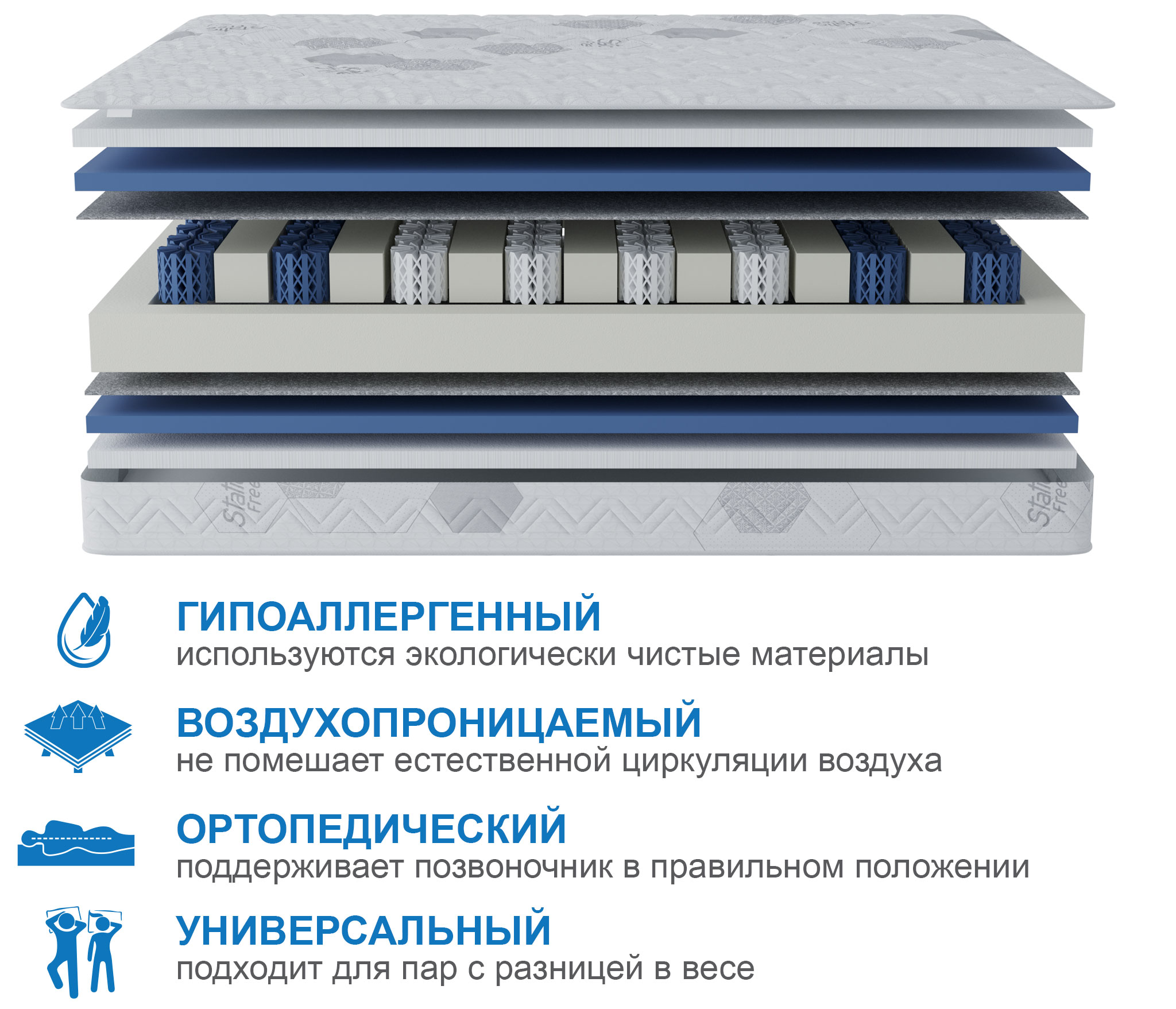 Мы рекомендуем матрас подросткам, людям, испытывающим проблемы со спиной, и всем, кто предпочитает жесткие матрасы. Матрас подарит вам здоровый сон заряд бодрости утром. Высокая жесткость матраса достигается за счет сочетания верхнего комфортного слоя из высокоплотной пены Sky Cell и дополнительных ребер жесткости в основе матраса.