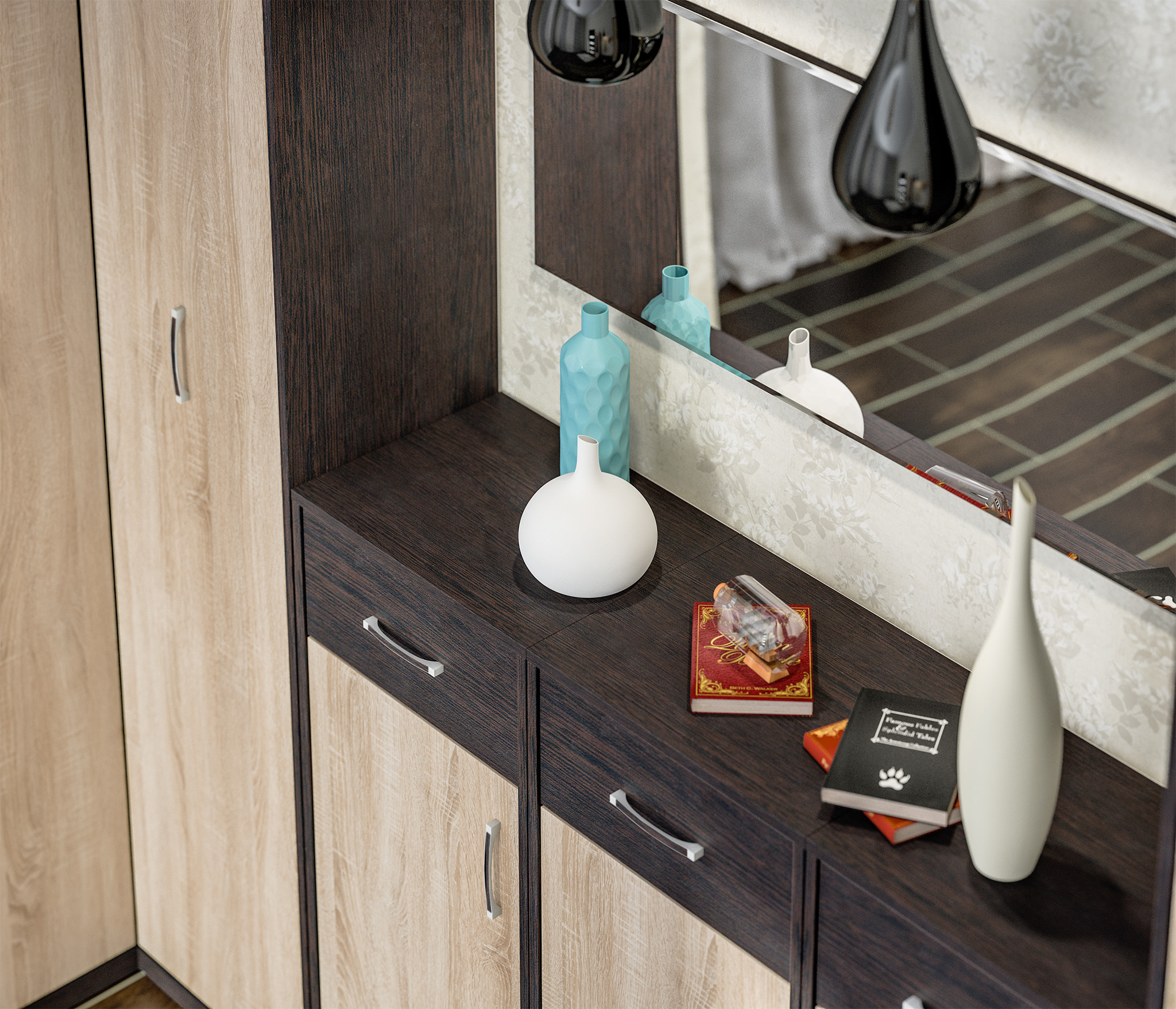 Произведена тумба Афина из прочного КДСП, устойчивого к мелким механическим повреждениям. Отделка комбинированная – корпус и фасадная поверхность ящика в цвете «Венге», фасадная поверхность дверцы в цвете «Дуб Сонома».