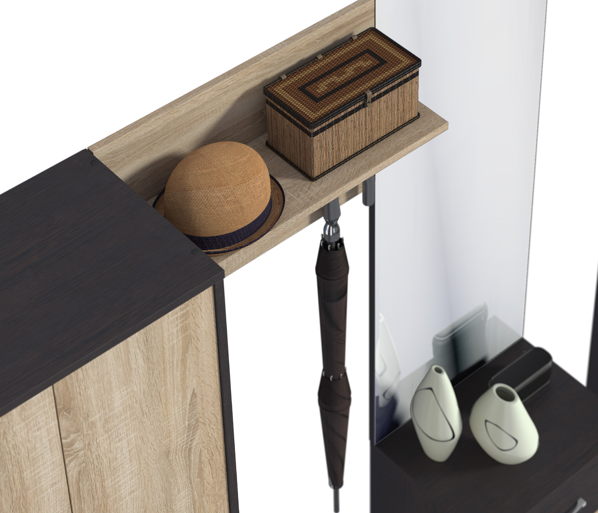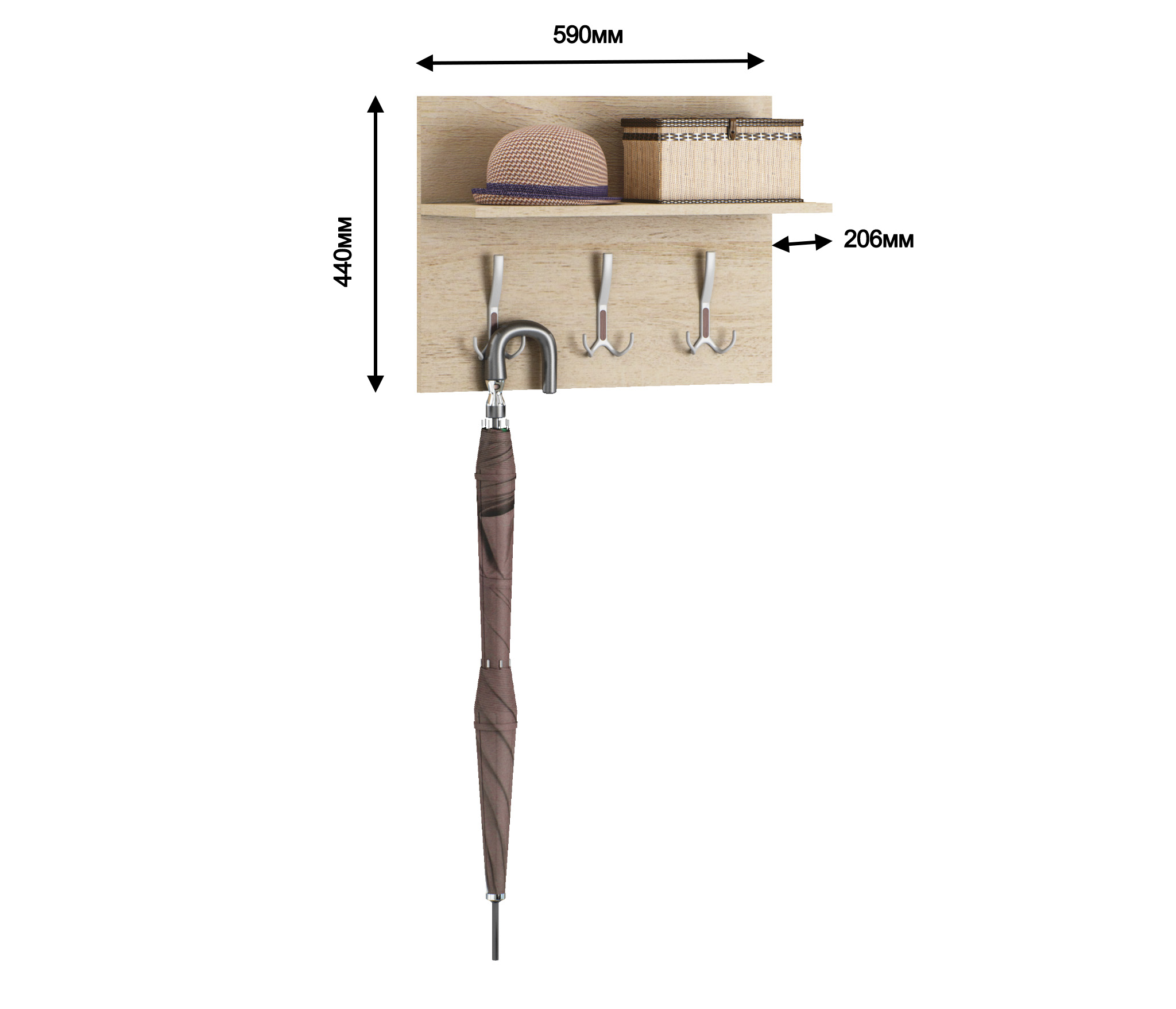 Афина СБ-2241 – настенная вешалка из модульной коллекции Афина. Это функциональный компактный предмет мебели может использоваться соло и идеально подойдет для небольшой прихожей. Габаритные размеры – ширина 59 см, высота 44 см и глубина 20 см. Выполнена вешалка из прочного КДСП, облицована декоративной плёнкой в оттенке «Дуб Сонома». Вешалка оснащена тремя прочными крючками и полкой. В комплект входят необходимые для крепления детали.