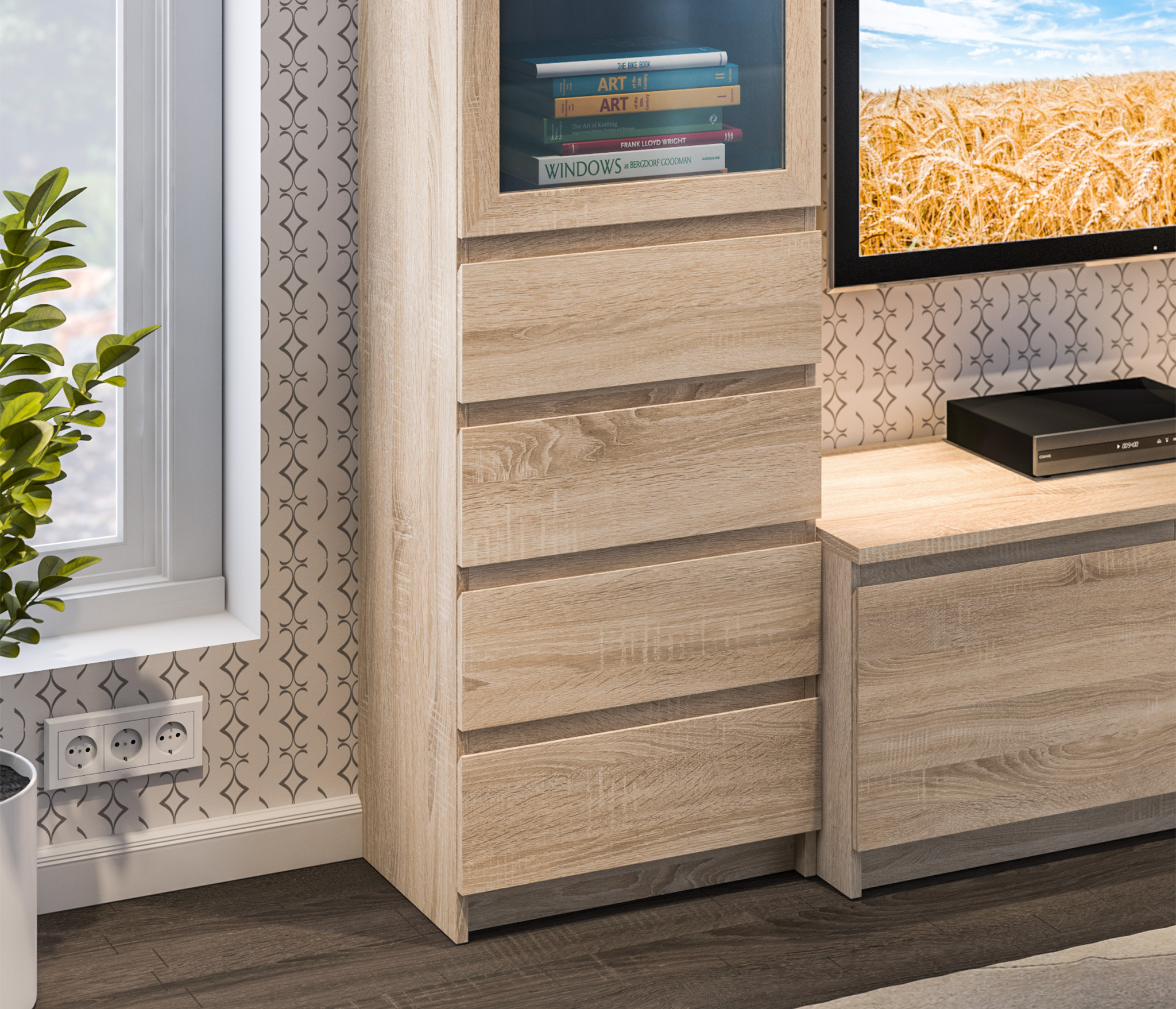 При компактных размерах – ширина 50 см, высота 222 см и глубина 35 см, это довольно вместительная витрина, которая позволит решить вопросы, связанные с хранением памятных вещей. Визуально витрина разделена на два отделения – верхнее – выставочное, находится за прозрачной дверцей и имеет четыре полки. Нижнее включает четыре вместительных выдвижных ящика.