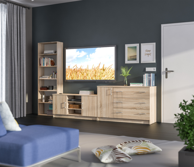 Модульная бюджетная гостиная Терра в светлом оттенке дуба сонома станет настоящим украшением Вашего дома. Элементы можно переставлять, дополнять и комплектовать по своему вкусу. Состав комплекта: Стеллаж600х1825х243мм, Комод 1190х754х443мм), Тумба ТВ 1190х554х373мм
