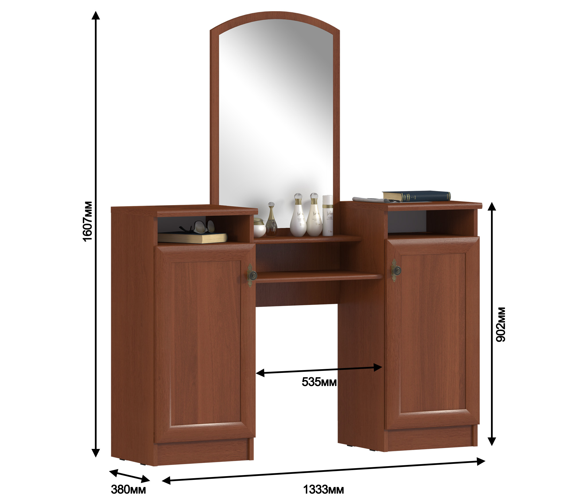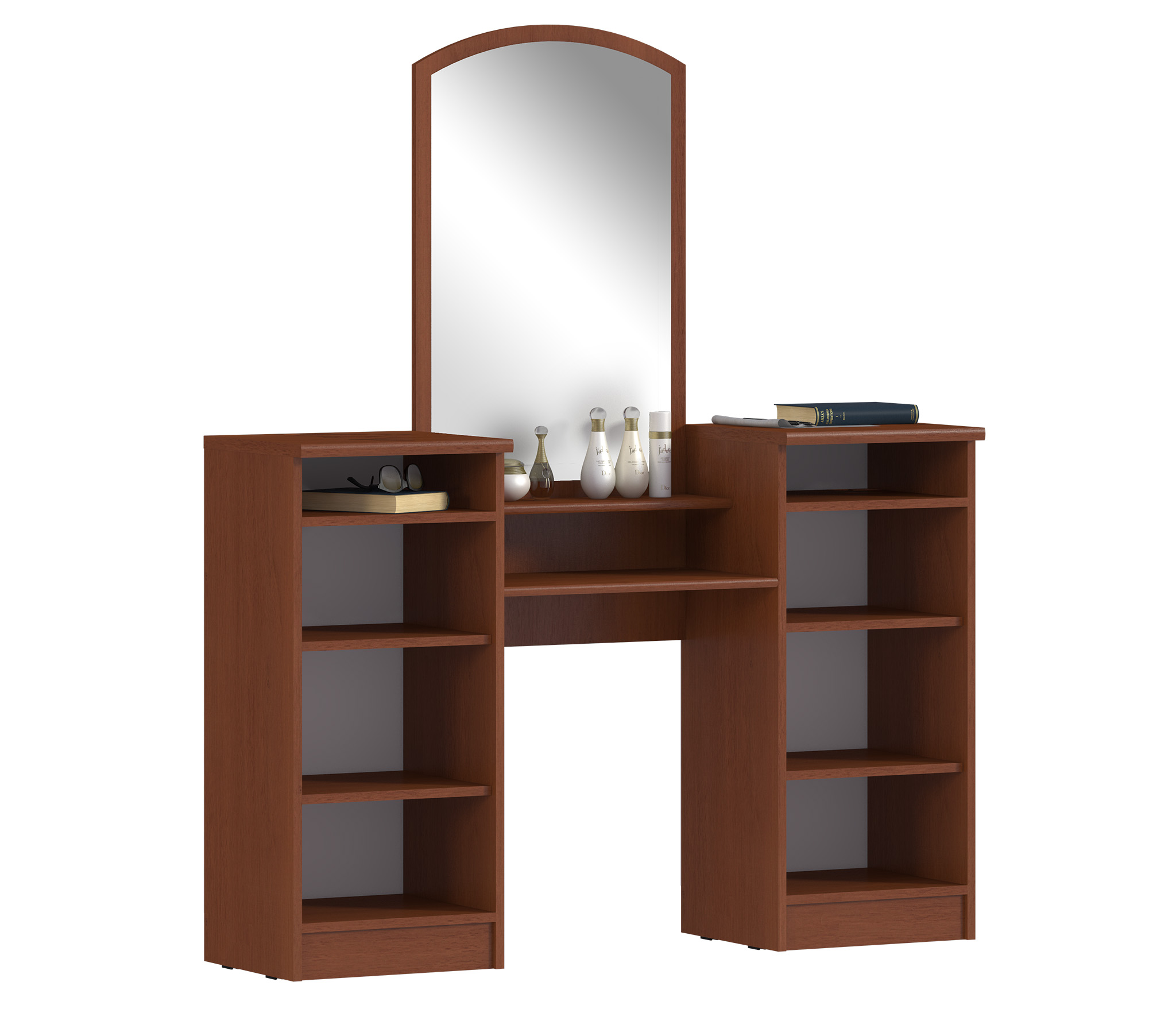Туалетный стол «Джорджия СБ-1145» необходим в каждой спальне, хозяйка которой стремится к идеальности во всем. Модель выполнена в классическом цвете «Итальянский Орех», что придает образу утонченность и аристократичность. Аккуратные очертания позволяют столу выглядеть уместно в любом интерьере, а продуманное зеркало по центру зрительно расширяет пространство комнаты. В вашем распоряжении окажется достаточно места для хранения косметики, аксессуаров, плойки, фена и других вещей, без которых не обходится ни одна женщина. Экологичность и высокое качество материалов гарантируют, что полки выдержат даже внушительный вес и не деформируются со временем.