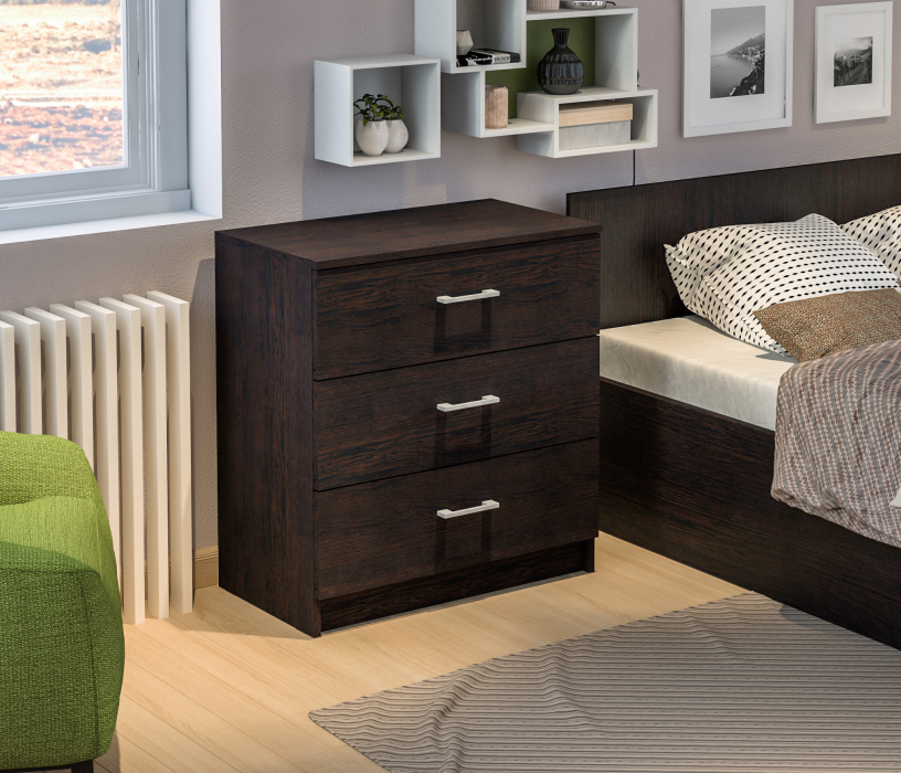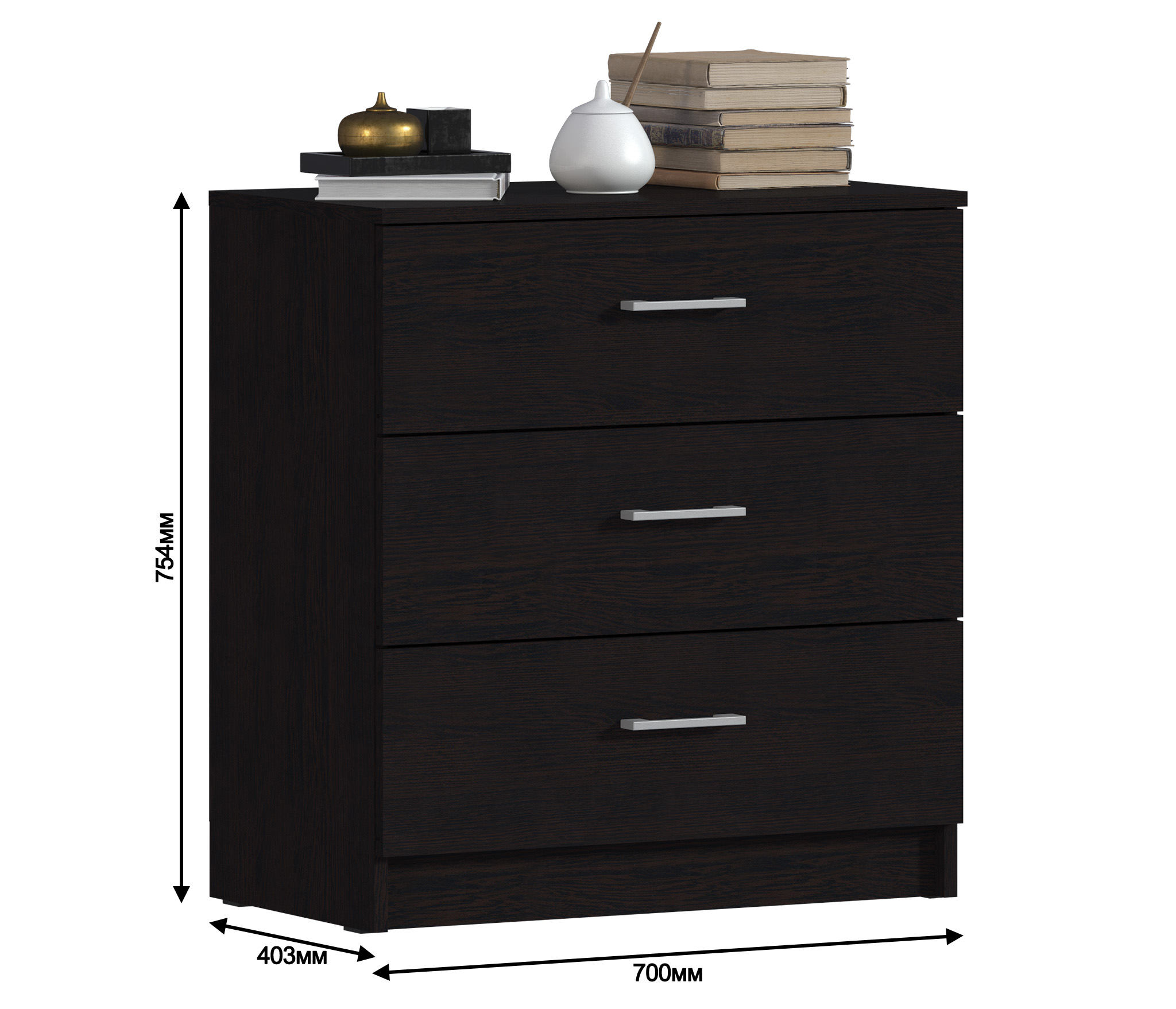 Благодаря компактным размерам – ширина 70 см, высота 75 см и глубина 40 см, комод Терра оптимально подойдет для помещений небольшой площади. Три довольно больших ящика комода Терра оснащены прочными и долговечными выдвижными механизмами. Цвет Венге и лаконичный дизайн придают комоду строгий и стильный вид.