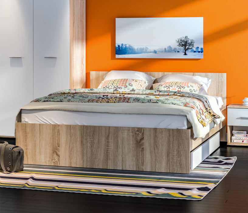 Кровать «Мамбо» – симпатичная и комфортабельная модель. Спальное место 160х200см. Модель выполнена из КДСП. Благодаря корпусу с текстурой под дерево и белым фасадам тумба может с успехом использоваться и в классических, и в суперсовременных интерьерах.