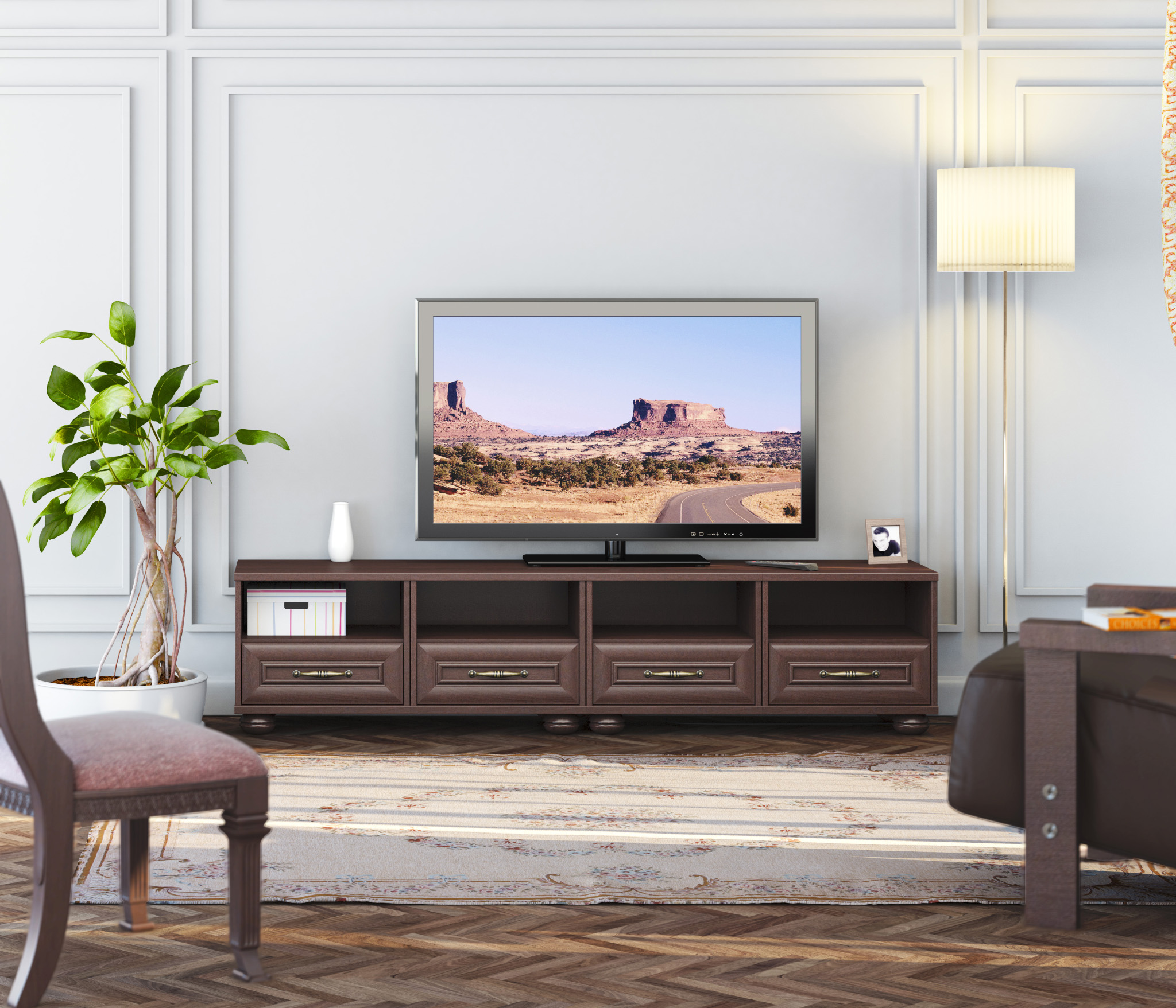 Ширина 1 848 мм, что позволяет разместить ТВ на тумбе.
