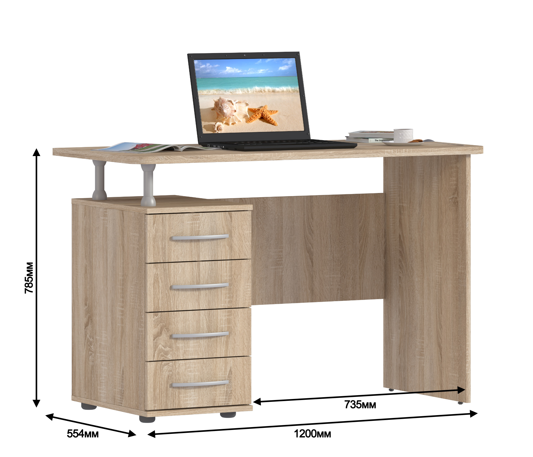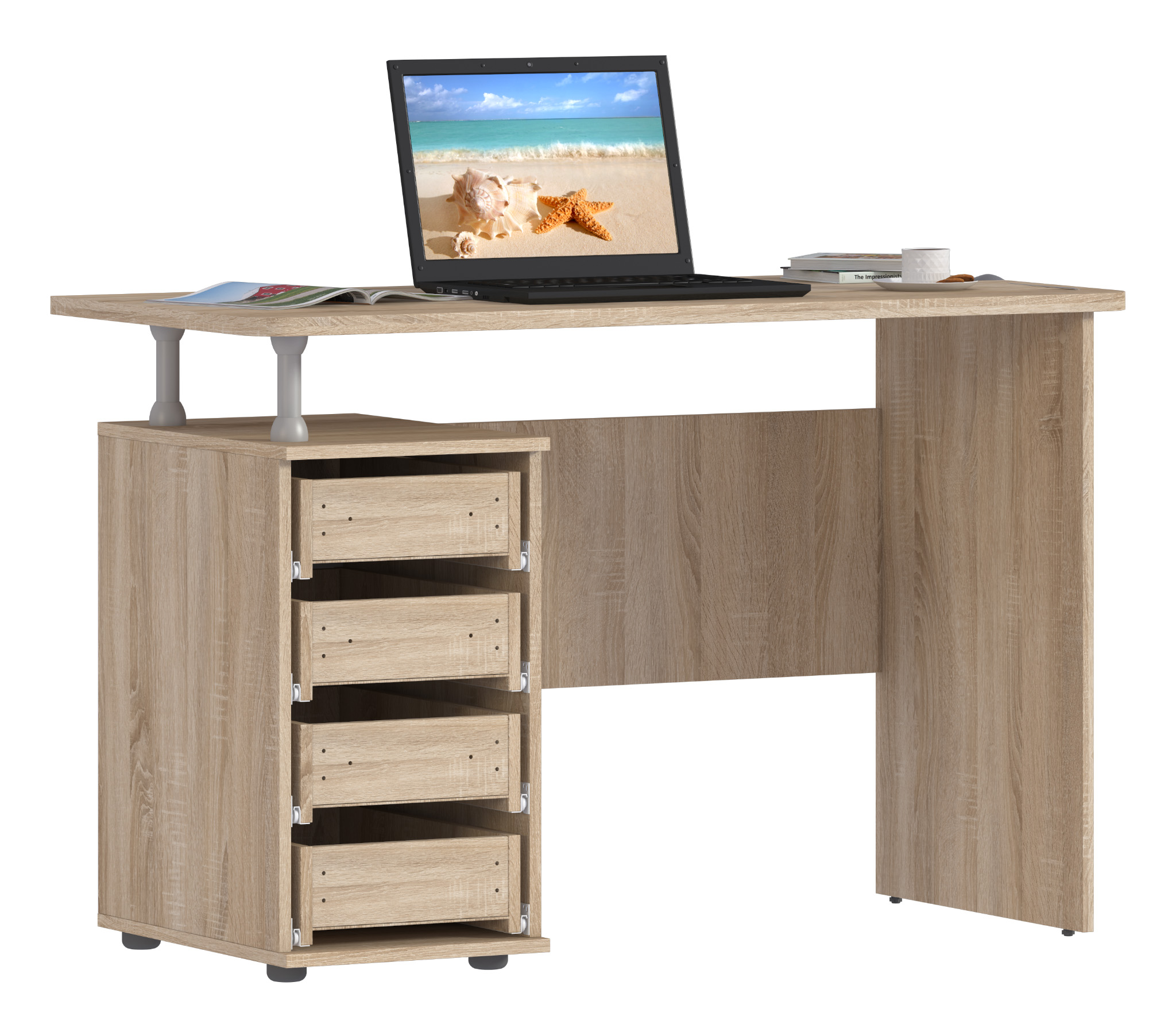 Компьютерный стол Дионис СБ-2356 - идеальное рабочее место. Продуманная конструкция и сравнительно небольшие размеры позволяют разместить его в комнате студента или школьника, в кабинете или в офисе. Габаритные размеры – ширина 120 см, высота 78 см и глубина 55 см. Под рабочей поверхностью находится тумба с четырьмя вместительными выдвижными ящиками. Стол производится из прочного и экологичного материала. Материал отделки устойчив к влаге и воздействию бытовых чистящих средств. Стол выполнен в цвете «Дуб Сонома». Благодаря стильному лаконичному дизайну, подобранной фурнитуре и светлому оттенку отделки стол Дионис не создает ощущение громоздкости.