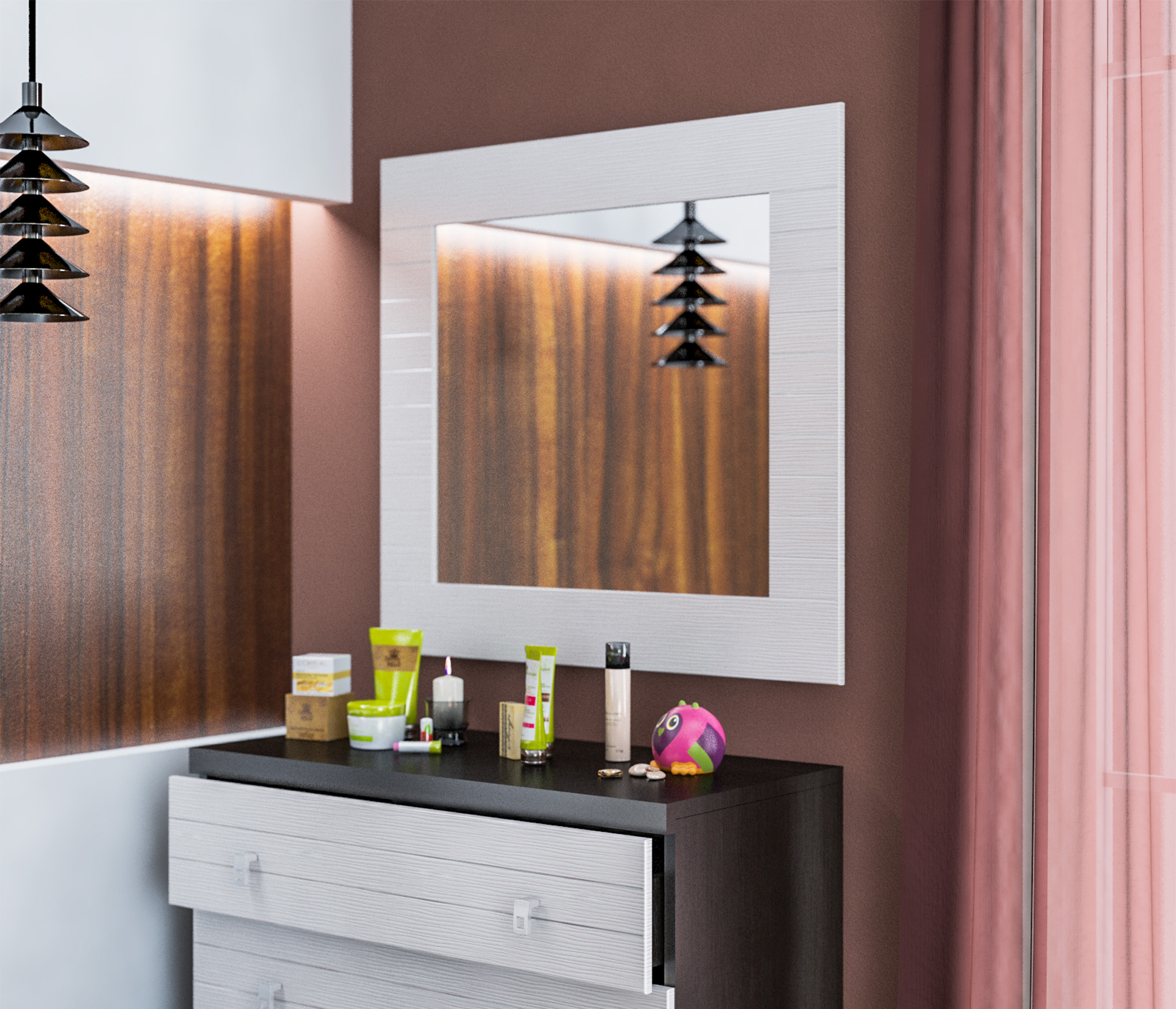 Квадратное зеркало в широкой фактурной раме из коллекции модульной спальни «Гретта». Для изготовления наших зеркал мы используем только проверенное сырье, надежную фурнитуру и интересный дизайн. Зеркало можно повесить на стену или установить на туалетном столике. Оно может выступать соло, а может дополнить панно из нескольких зеркал. Фантазируйте, вы сами создаете свой интерьер! И еще наш совет, поставьте перед зеркалом светильник, свет ламп отраженный в зеркале придаст комнате дополнительную глубину и объем. Рамка выполнена из МДФ, цвет Онденс.