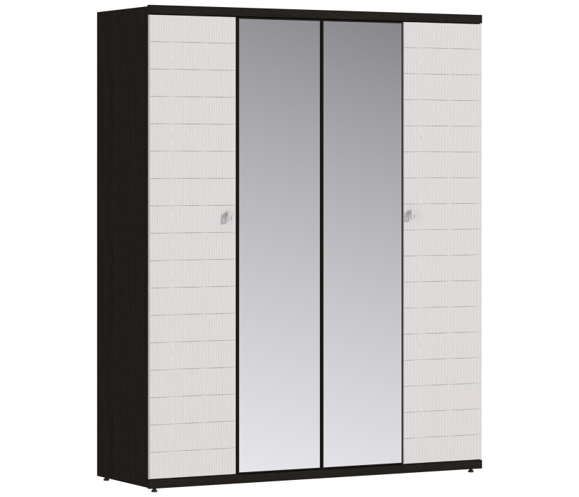 Лаконичный четырехдверный шкаф с зеркальными вставками. Ничего лишнего — прострая геометрия и максимальная вместимость. Внутри находится отделение с полкой и перекладиной и три секции с дополнительными полками.
