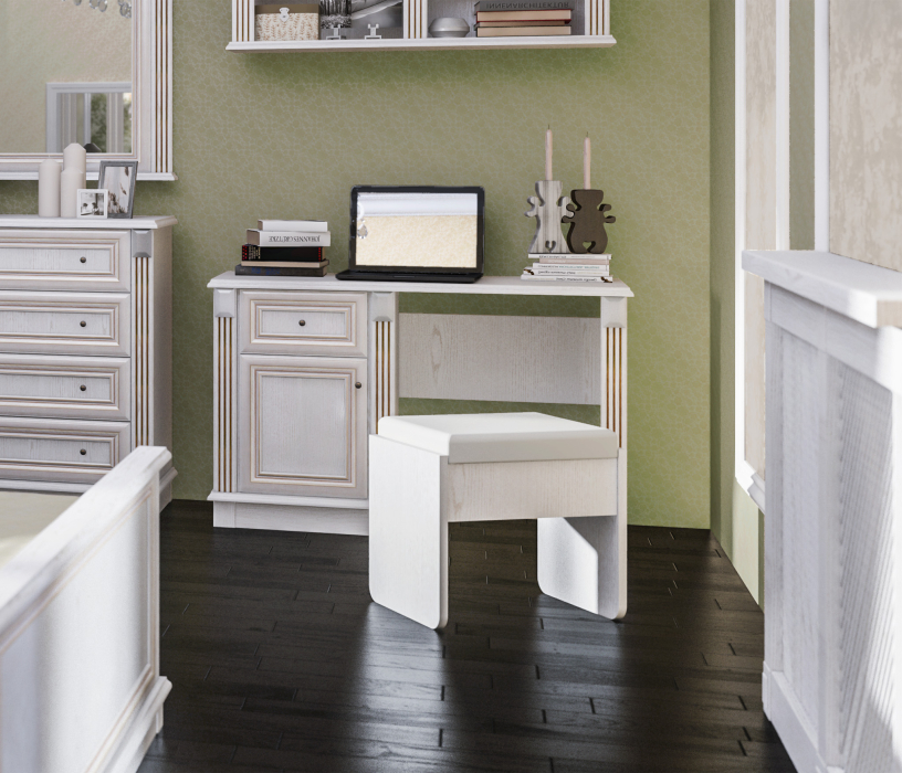 Версаль СБ-2320 – компактный пуф, который идеально впишется в интерьер любого назначения – спальню, прихожую, кабинет. Может использоваться соло, а может стать стильным дополнением к гарнитуру Версаль. Габаритные размеры – ширина 49 см, высота 47 см и глубина 35 см. Лаконичная конструкция, мягкое сиденье, отсутствие навязчивого декора, светлый оттенок отделки «Белый ясень» – всё это создает впечатление легкости.