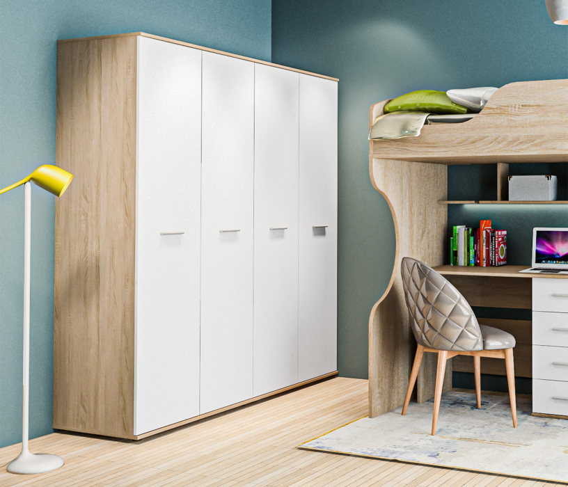 Четырехдверный шкаф из серии «Мамбо» – просто находка для меблировки детской комнаты. Это отличная система хранения. В вашем распоряжении окажется одно просторное платяное отделение со штангой для плечиков, где, пожалуй, можно разместить весь детский осенне-зимний гардероб, да еще и останется место для школьной формы и любимых джинсов. Две секции отданы под многочисленные полки, на которых удобно складировать немнущиеся вещи и нижнее белье с носочками. Универсальный дизайн позволит модели вписаться в обстановку детской комнаты, выдержанной в светлых тонах. Сам шкаф имеет приятный пастельный тон «Дуб Сонома» с более светлыми, песочными фасадами. Качество материалов изготовления соответствует международным стандартам безопасности, разработанных для детских изделий.