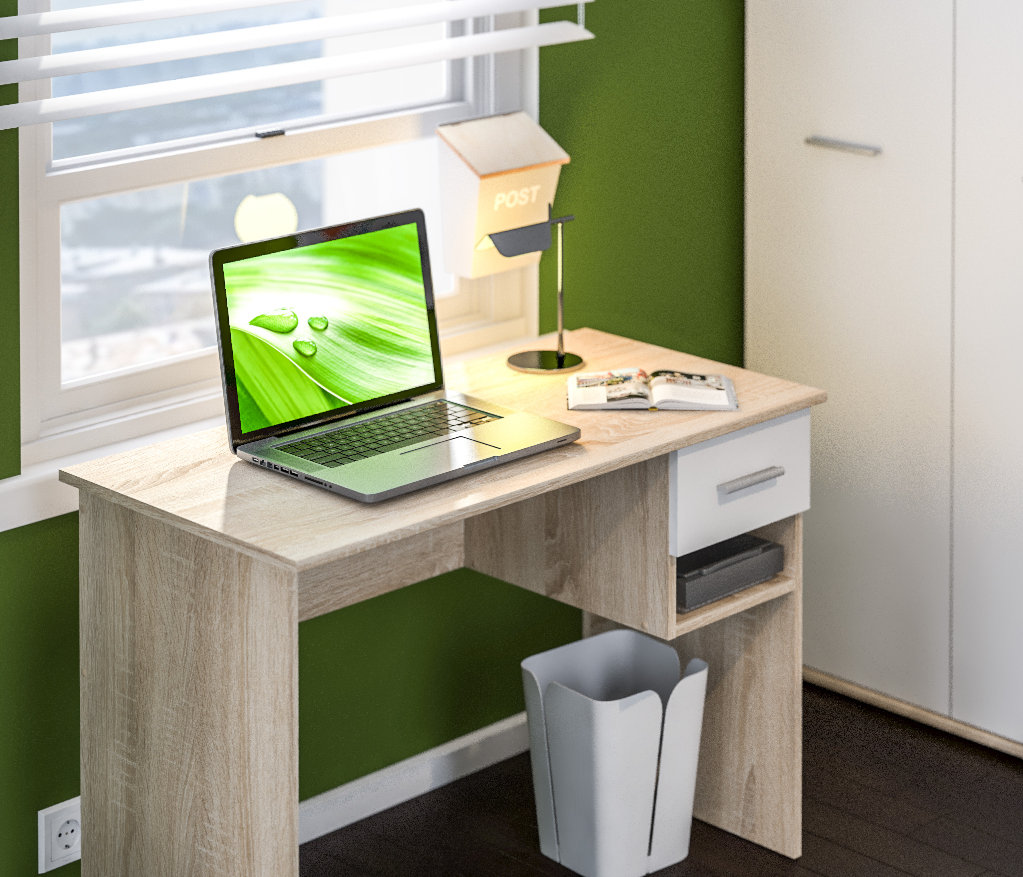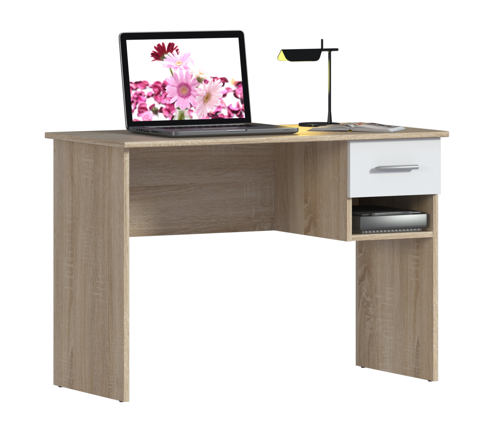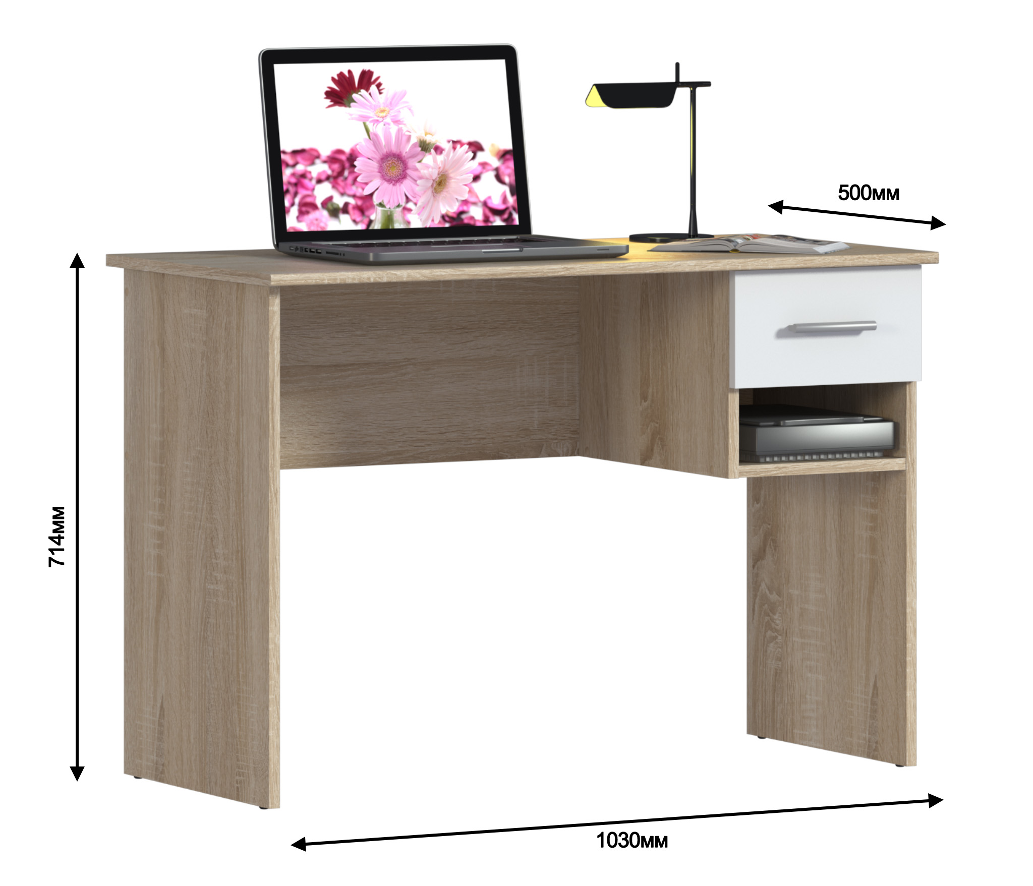 Письменный стол Мамбо СБ-2370 – комфортное рабочее место, где можно разместить ноутбук или любое периферийное оборудование. Идеален для детской комнаты или комнаты подростка. Его можно дополнить элементами из модульной коллекции Мамбо. Габаритные размеры – ширина 103 см, высота 71 см, глубина 50 см. Под столешницей размещен вместительный выдвижной ящик, под ящиком – открытая полка. Модель производится из прочного КДСП. Корпус в цвете «Дуб Сонома». Текстура отделки практически не отличается от природного дерева. Фасады оформлены в белом цвете.