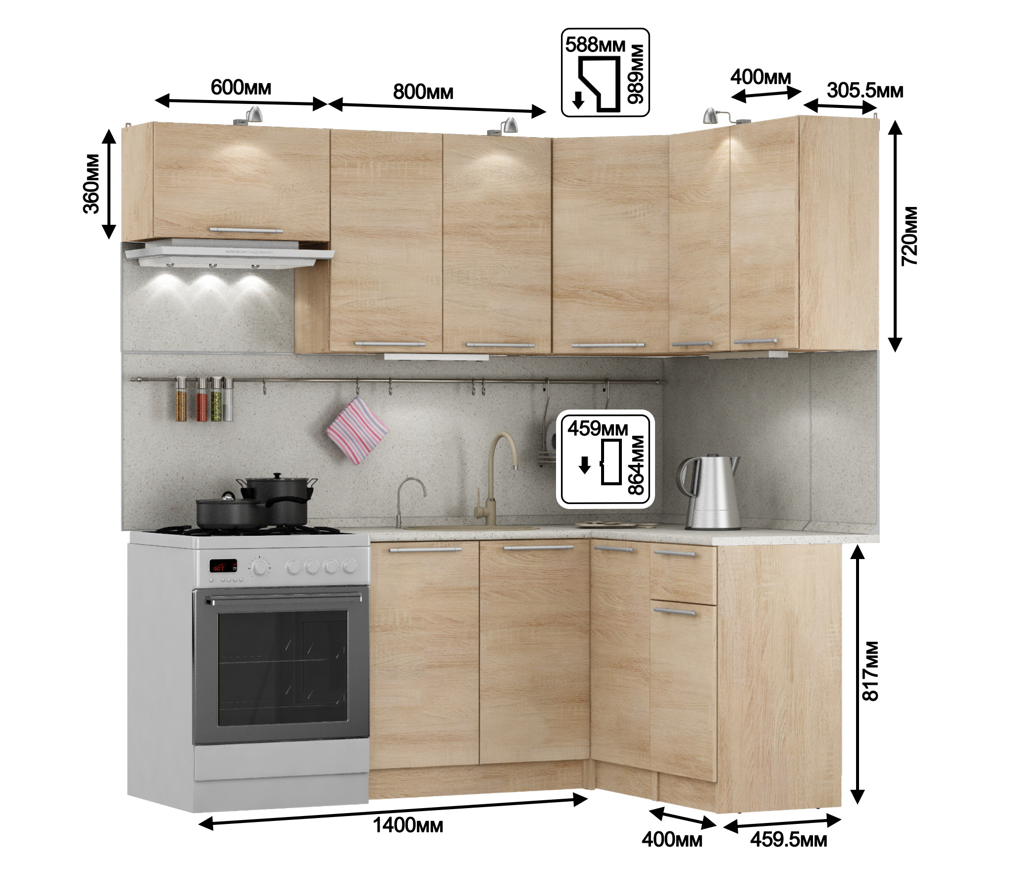 Кухня угловая Ангелина Классик 2 х 1,4 м (Дуб Сонома)