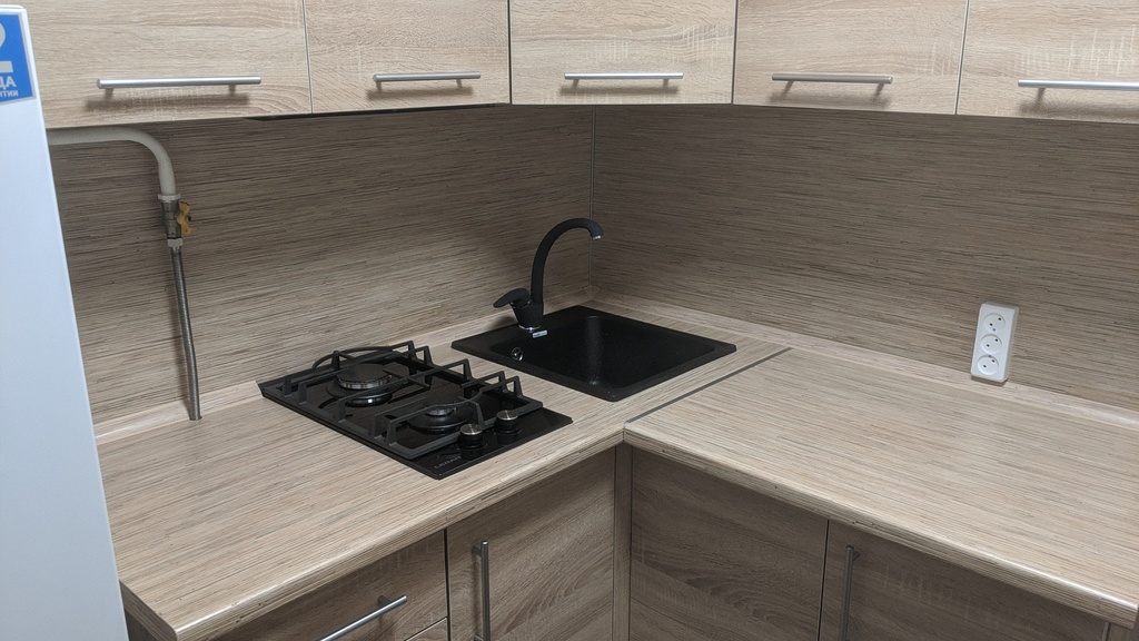 Угловой гарнитур 140х140 см вышел по цене всего 15680 руб. НО! это стоимость только корпусов шкафов с дверцами и ручками. Дополнительно покупались столешница, настенная панель, плинтусы с уголками, кромка, торцевые планки, монтажная шина, мебельные стяжки, навески (те, что идут в комплекте, просто никуда не годятся). Получилось ещё пол столько же от цены, но всё равно очень неплохо. Удалось даже встроить стиральную машину. Правда, для этого пришлось поднять весь гарнитур на 7 см. Ещё из-за газовой трубы надо было обрезать верхний угловой шкаф на 1,5см, но и с этой задачей удалось справиться успешно. Чем меньше кухня, тем сложнее вписать в неё готовый мебельный гарнитур, но с этой "Ангелиной" всё получилось. И для тех, кто будет собирать и устанавливать кухню самостоятельно, два обязательных момента: во-первых, стягивайте все шкафы, как верхние, так и нижние, между собой мебельными стяжками; во-вторых, обязательно крепите нижние шкафы к стене.