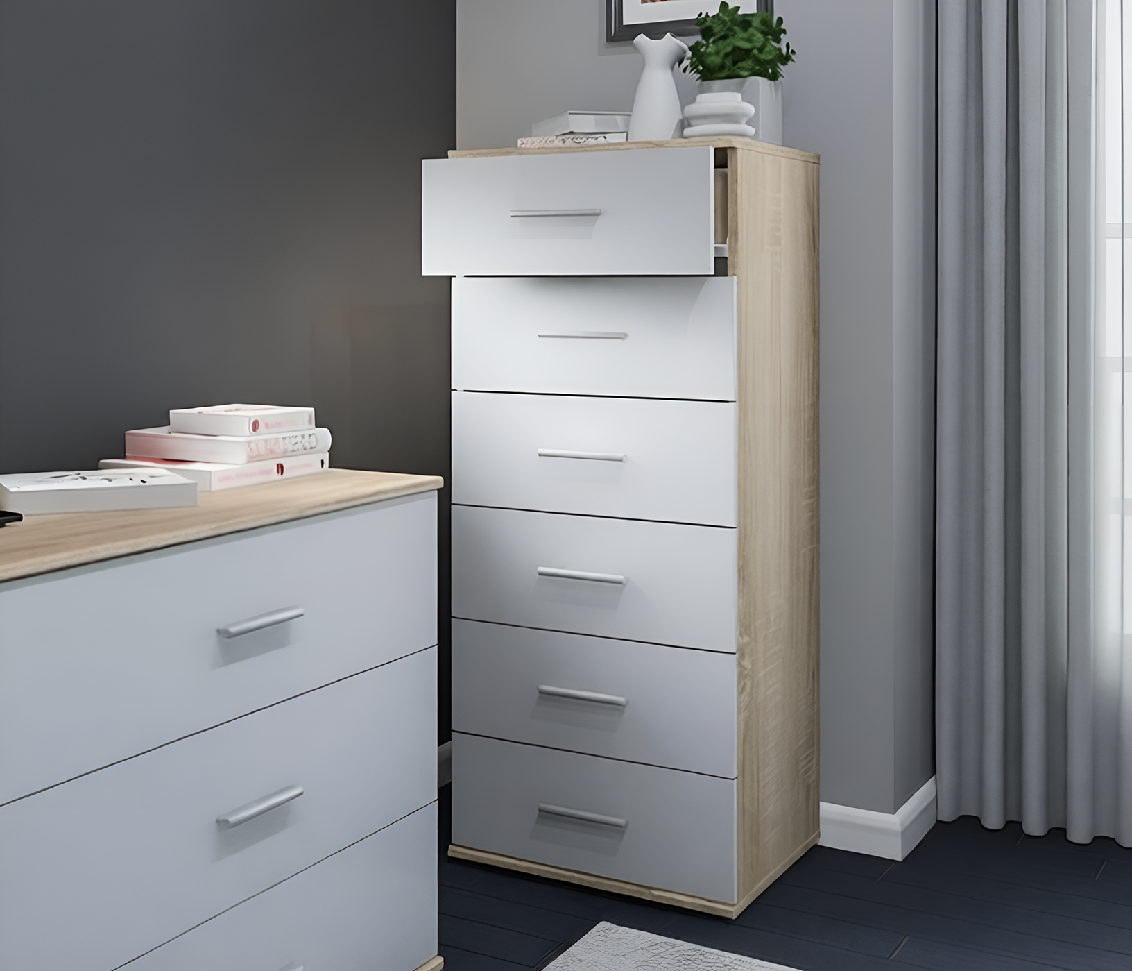 Комод Мамбо имеет довольно компактные габариты -- ширина 50 см, высота 121 см и глубина 44 см. Однако его обладатели никогда не жаловались на вместительность. В шести выдвижных ящиках можно разместить множество нужных вещей.