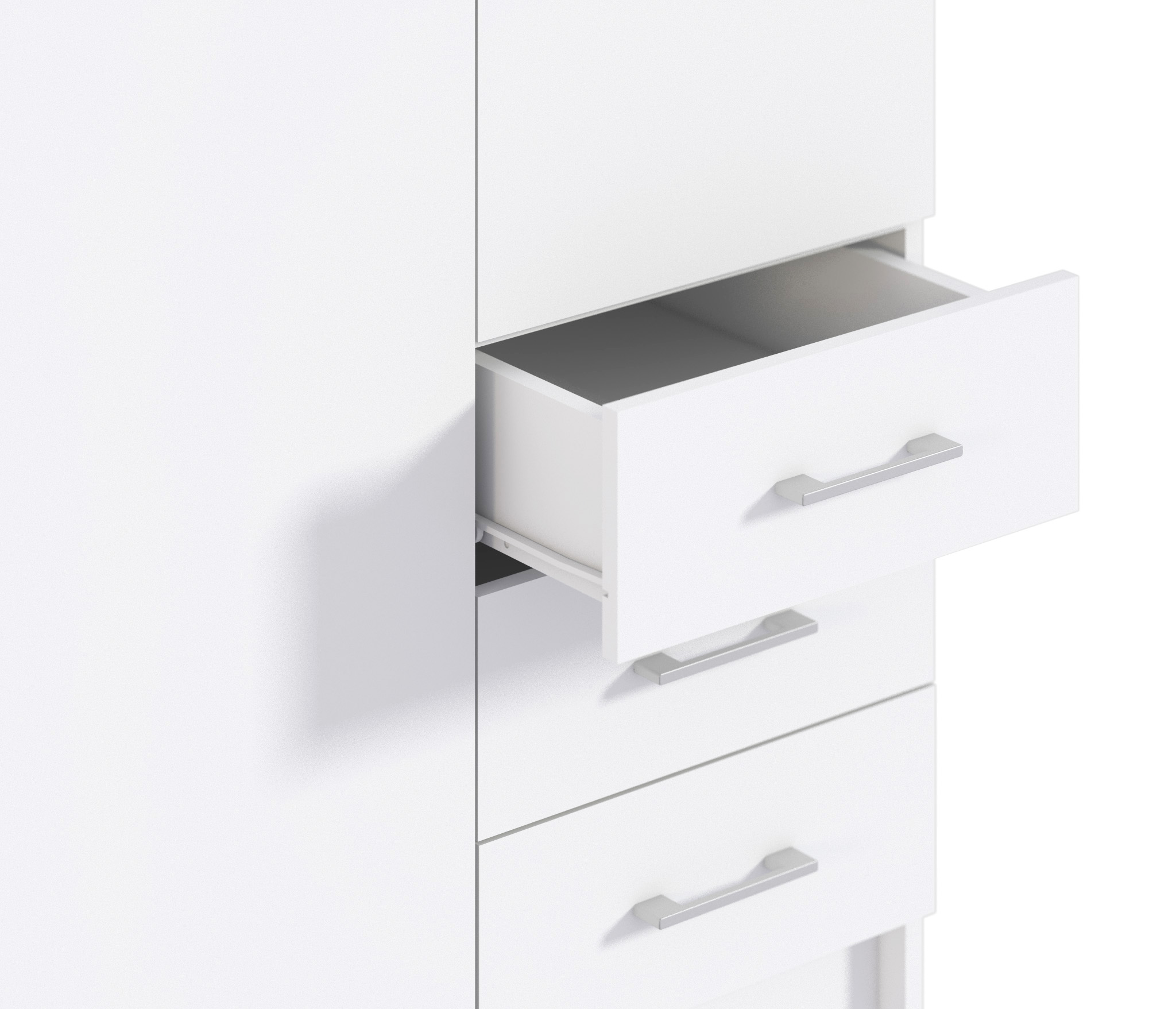 Габаритные размеры шкафа Терра далеки от компактных – ширина 120 см, высота 200 см и глубина 57 см. Он может быть отдельным предметом мебели, а также частью гарнитура. Шкаф имеет вместительное плательное отделение со штангой, над которым расположена антресоль и отделение с полками и тремя выдвижными ящиками, где можно хранить мелкие аксессуары. Выполнен шкаф из прочного и качественного ЛДСП. Внешняя отделка в белом цвете.