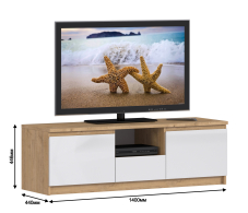 Габаритные размеры – ширина 140 см, высота 44 см и глубина 44 см. Вес тумбы 33,92 кг, что даёт возможность передвигать её по усмотрению. Визуально тумбу можно разделить на три отделения. В центре над выдвижным ящиком расположена открытая полка. По бокам два вместительных отделения за отдельными дверцами. Отличительной особенностью тумбы является отсутствие ручек, которые интегрированы в фасады. ¶Тумба выполнена в лаконичном дизайне из экологичного современного ЛДСП. Материал отделки устойчив к влаге и воздействию бытовых чистящих средств, что актуально для светлых поверхностей.
