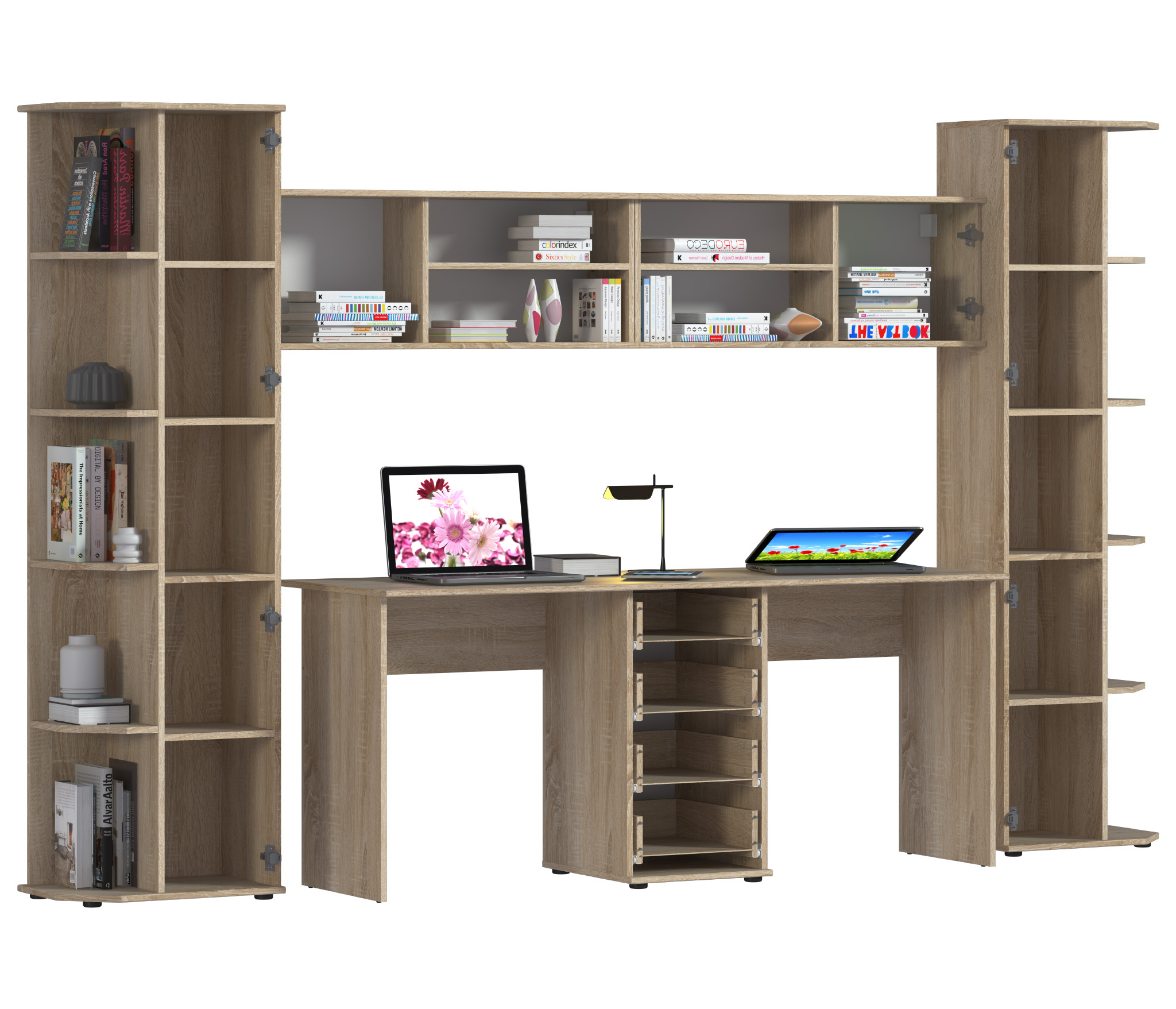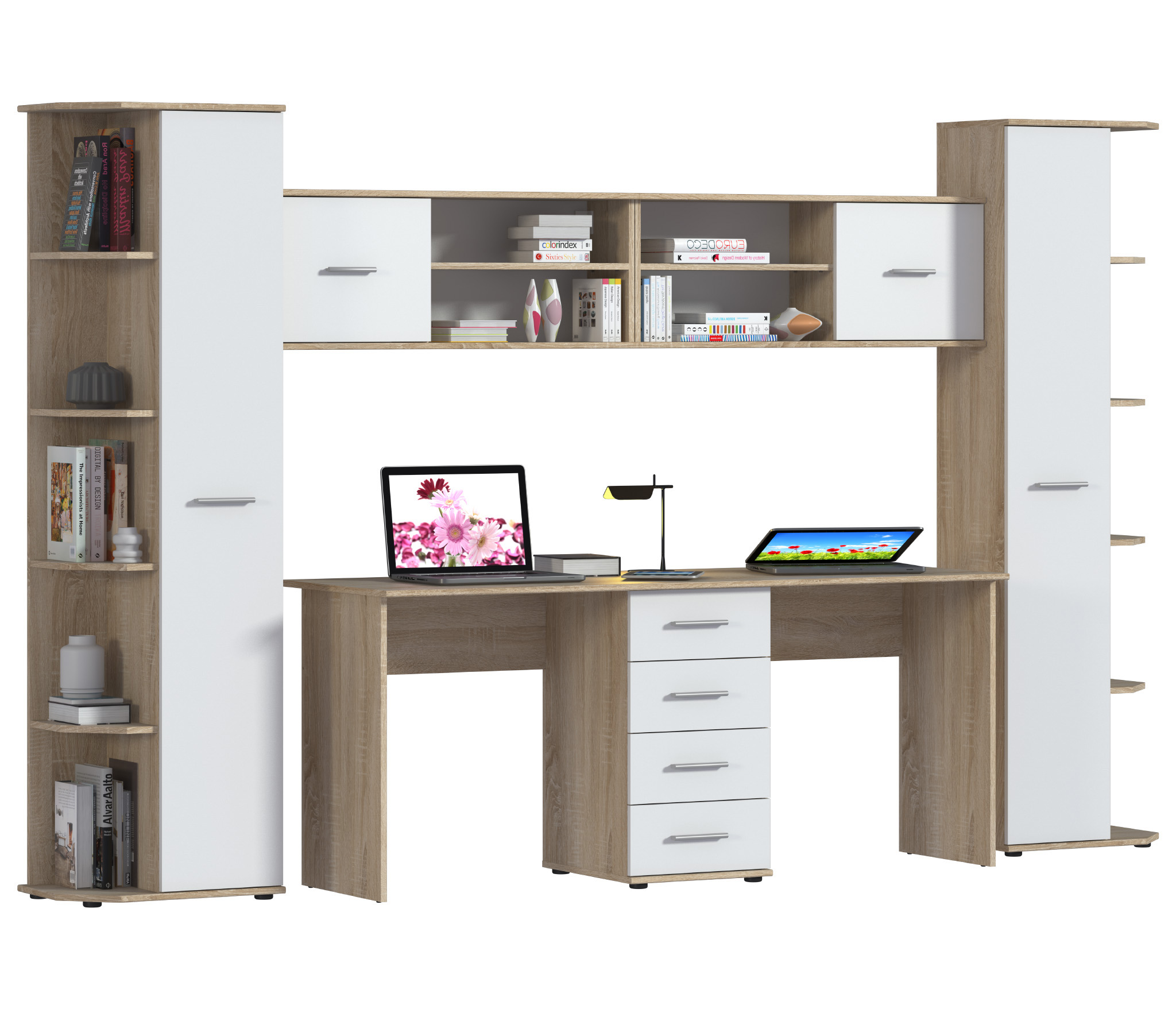 Комплект «Мамбо» для школьника – идеальное экономия пространство в комнате! Рабочее место для двоих детей и шкаф пенал, где можно разместить учебники и тетради. Мебель выполнена из ЛДСП, отличающейся прочностью и долговечностью. Благодаря корпусу с текстурой под дерево и белым фасадам тумба может с успехом использоваться и в классических, и в суперсовременных интерьерах. Цвет Дуб Сонома/Белый.