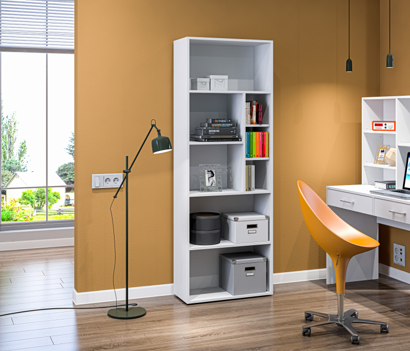 Габаритные размеры – ширина 65 см, высота 182 см и глубина 28 см. Конструкция стеллажа представляет собой ряд открытых полок на пяти уровнях. Две нижних и верхняя полки одинакового размера. Две средних полки поделены на секции. Выполнен стеллаж из современного прочного материала ЛДСП. Материал отделки чисто белого цвета, устойчив к влаге и воздействию бытовых моющих средств. Стеллаж оснащен протекторами или «лапками», которые не дают повредить пол. Для обеспечения максимальной устойчивости стеллаж надежно крепится к стене. Все необходимые крепёжные элементы входят в комплект.