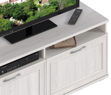 Тумба под телевизор Флоренция СБ-2406, выполненная в классическом дизайне, будет одинаково органично смотреться как в спальне, так и в кабинете или гостиной. Может быть элементом модульного гарнитура Флоренция. Габаритные размеры – ширина 132 см, высота 52 см, глубина 44 см. Визуально тумба делится на два симметричных отделения. Под столешницей расположены открытые полки, под ними отделения за отдельными дверцами. Корпус тумбы производится из экологичного материала – КДСП, рамочные фасады - из МДФ. Материал отделки в цвете «Дуб Сонома белый» не уступает по тактильным ощущениям природному дереву.