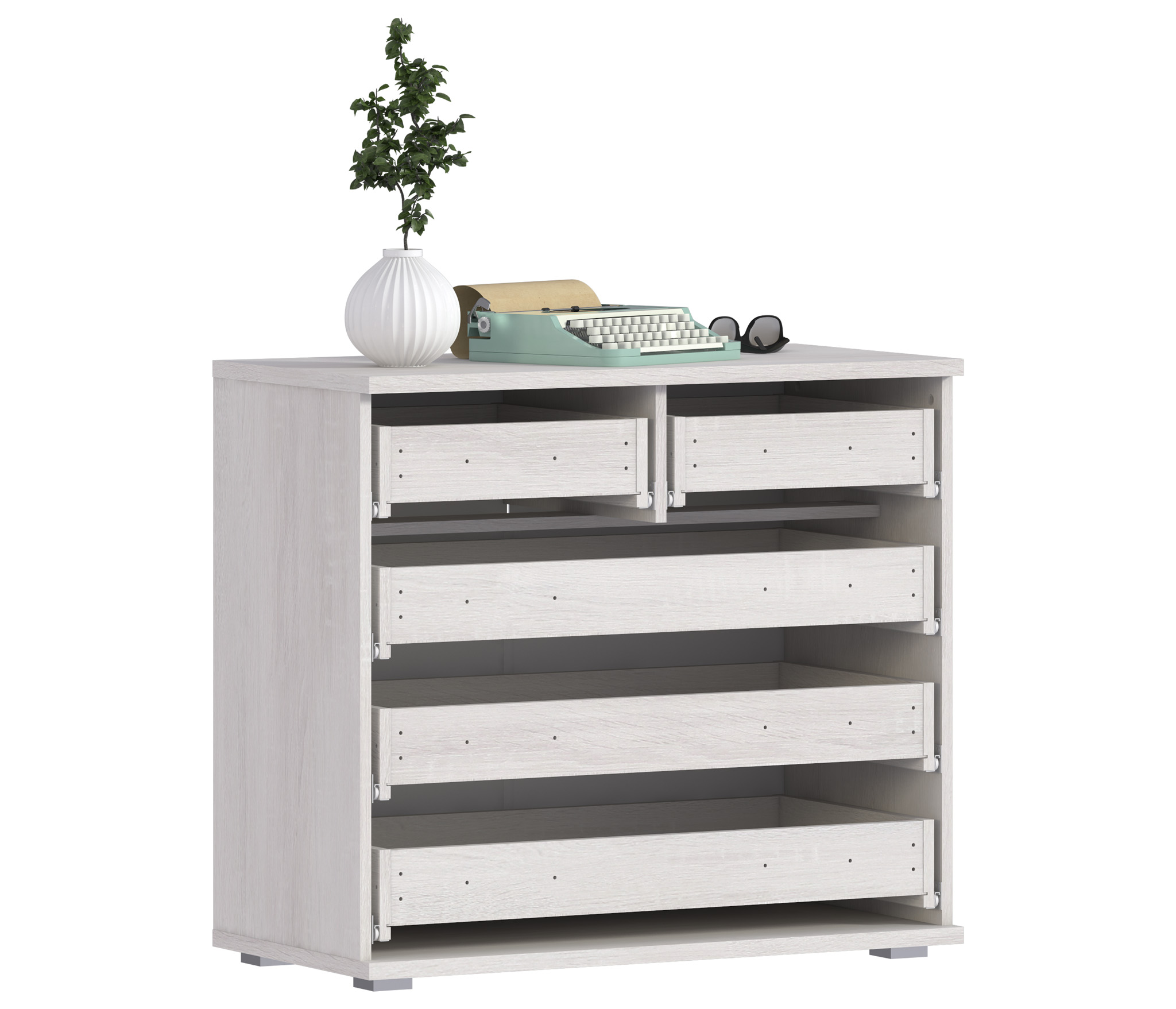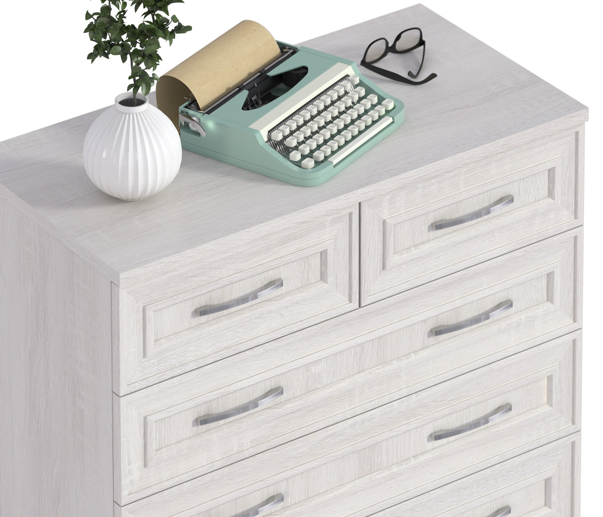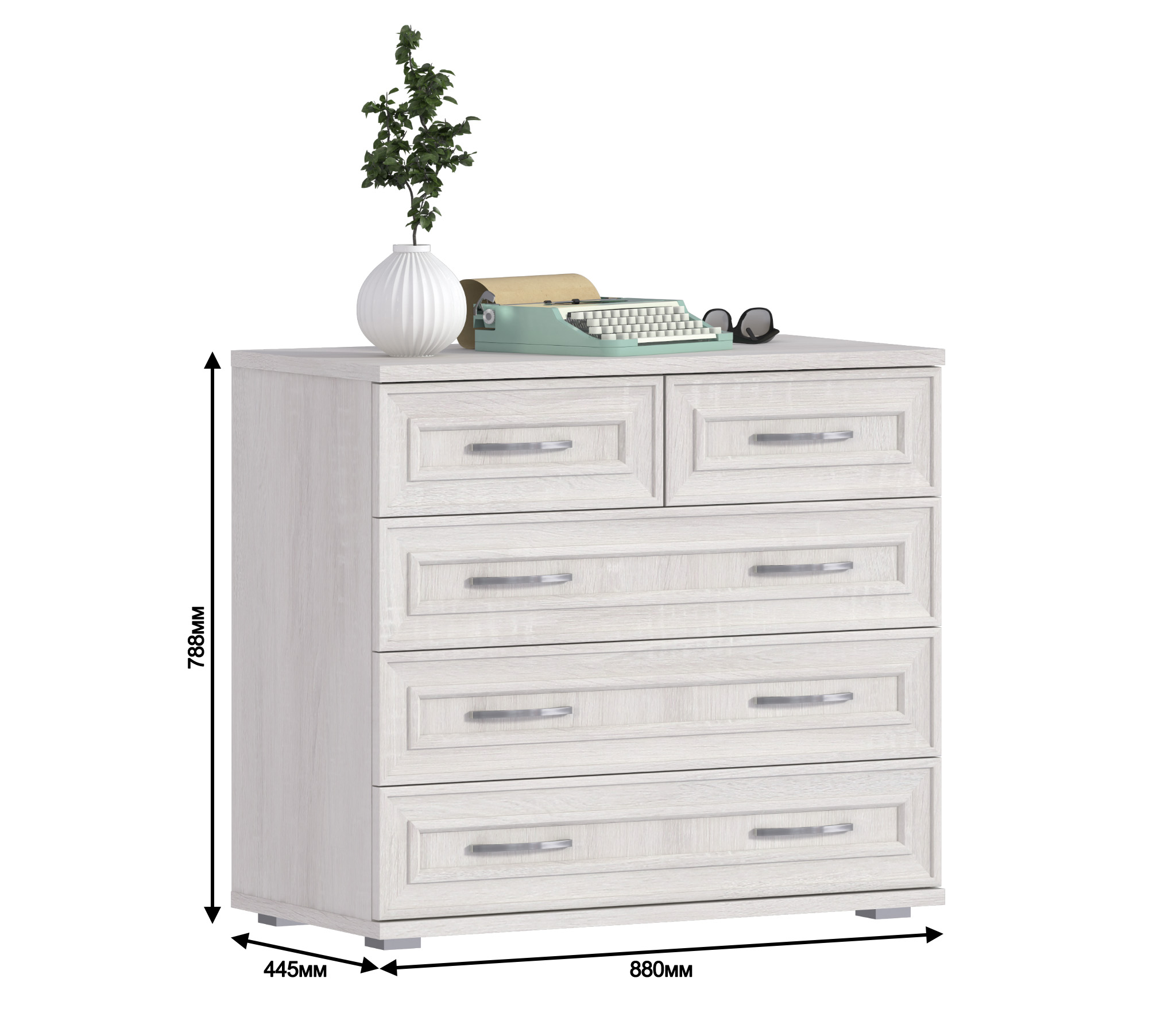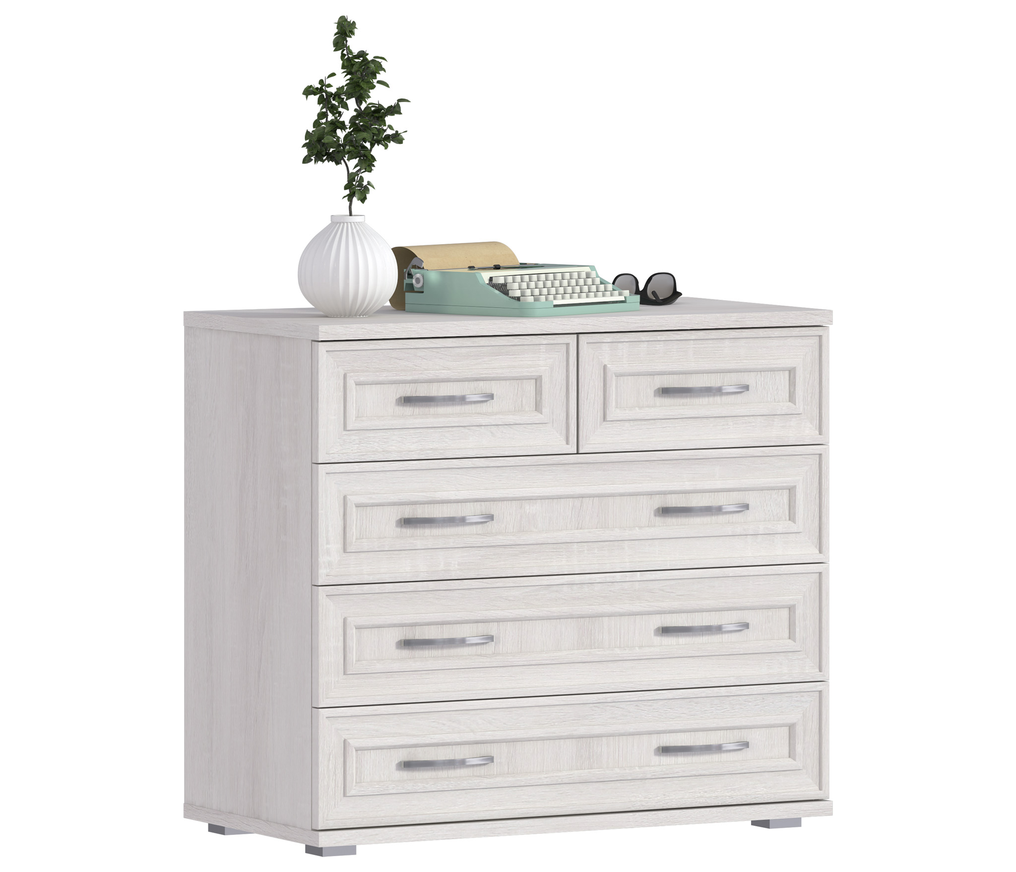 Стильный, функциональный и практичный комод Флоренция СБ-2394 станет украшением как гостиной, так и прихожей, спальни или кабинета.¶Габаритные размеры комода – ширина 88 см, высота 78 см и глубина 45 см. Сразу под столешницей размещены два небольших, на половину ширины комода, выдвижных ящика, расположенных рядом друг с другом. Под ними располагаются три больших выдвижных ящика уже на всю ширину.¶Материал комода Флоренция – прочный, влагостойкий, устойчивый к мелким механическим повреждениям. Цвет покрытия «Дуб Сонома Белый».¶Аккуратная фурнитура, лаконичный дизайн, вместительность – все это о комоде Флоренция СБ-2394