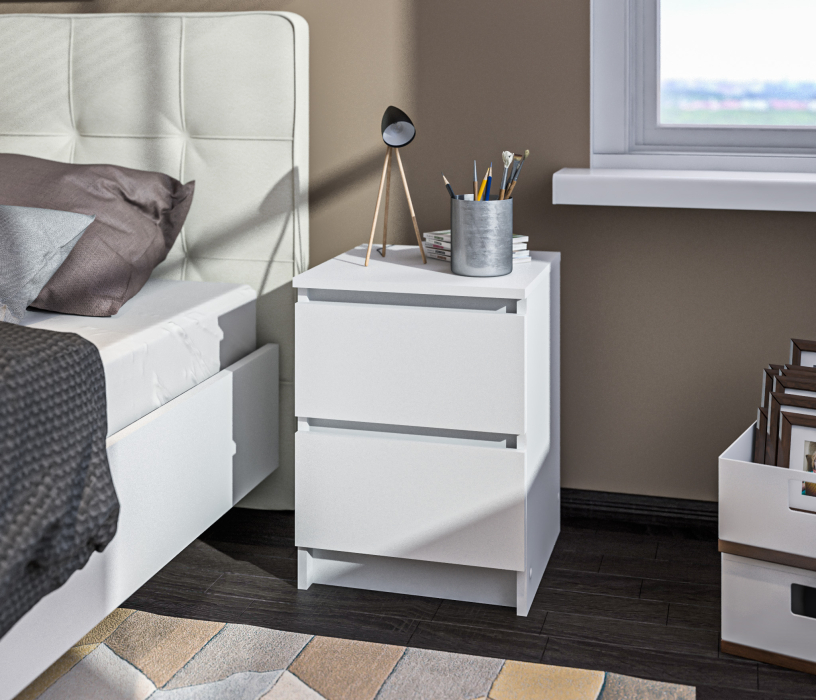Габаритные размеры тумбы довольно компактны - ширина 39 см, высота 53 см, глубина 39 см. Под столешницей расположены два ящика, оснащенных прочными выдвижными механизмами. Тумба идеально подойдет для оформления вашей спальни или детской в современном стиле. Тумба выполнена из прочного современного КДСП.