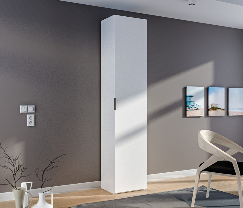 Модульность элементов позволяет самостоятельно создать шкаф с нужными вам параметрами: расположение и количество полок, ящиков, штанг и вариантов дверей зависит только от вашей фантазии.