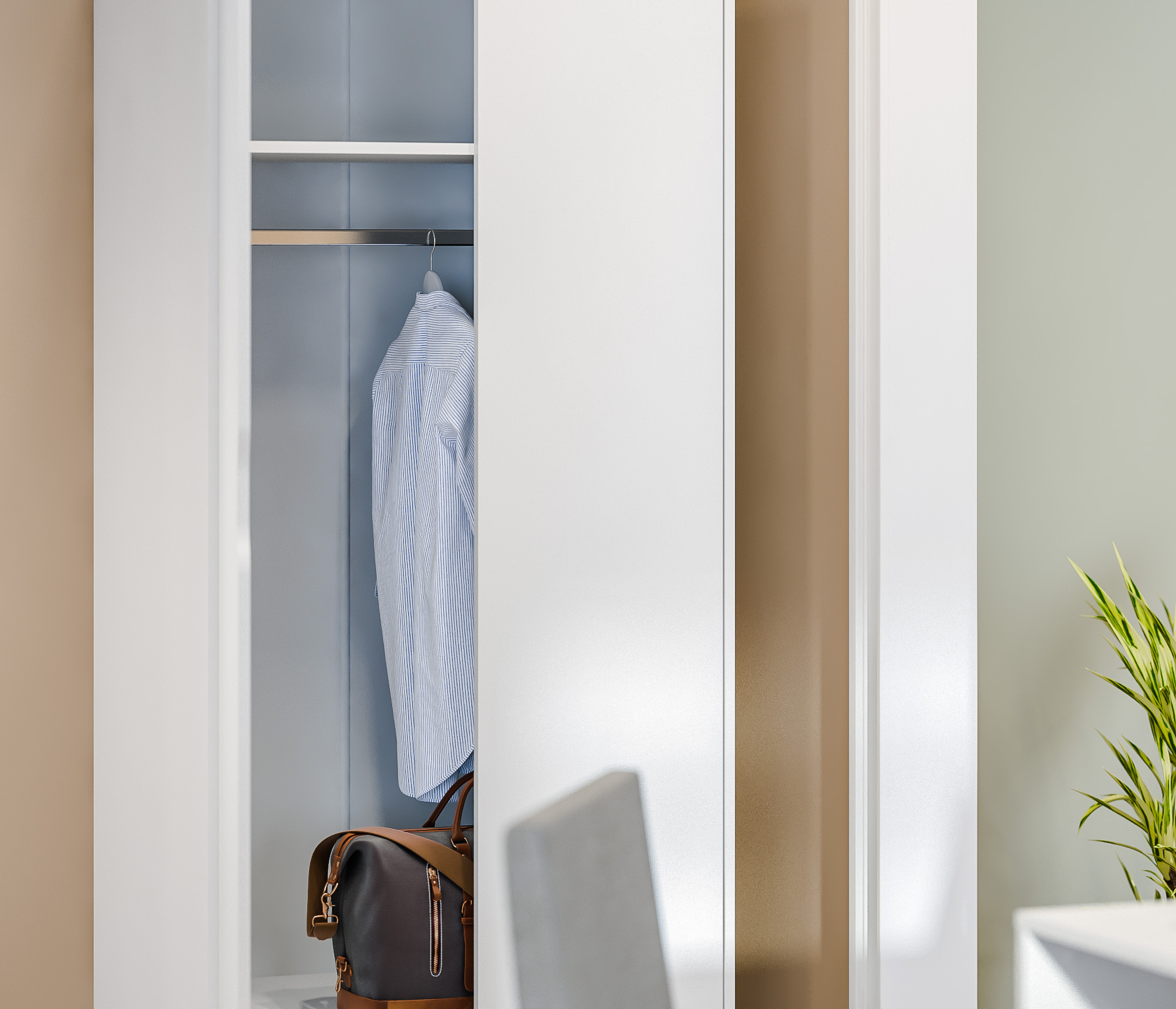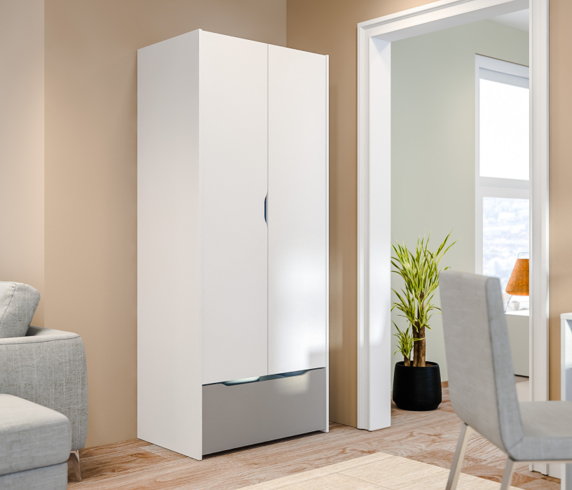 Двухдверный шкаф Mika СБ-3272 стильный элемент модульной коллекции Mika, которая была разработана специально для детских и подростковых комнат. Это универсальное место хранения, которое можно использовать как соло, так и в составе гарнитура. Габаритные размеры – ширина 83 см, высота 200,4 см и глубина 55,7 см. Шкаф имеет плательное отделение со штангой для плечиков и в нижней части есть вместительный выдвижной ящик. Корпус шкафа выполнен из прочного ламинированного ДСП, отделка в цвете «Белый альпийский». Материал фасадных поверхностей – ЛДСП в цветах отделки «Белый альпийский» и «Серый перламутровый». Вся мебель коллекции выполнена в лаконичном дизайне, без лишнего декора и безопасна в использовании.