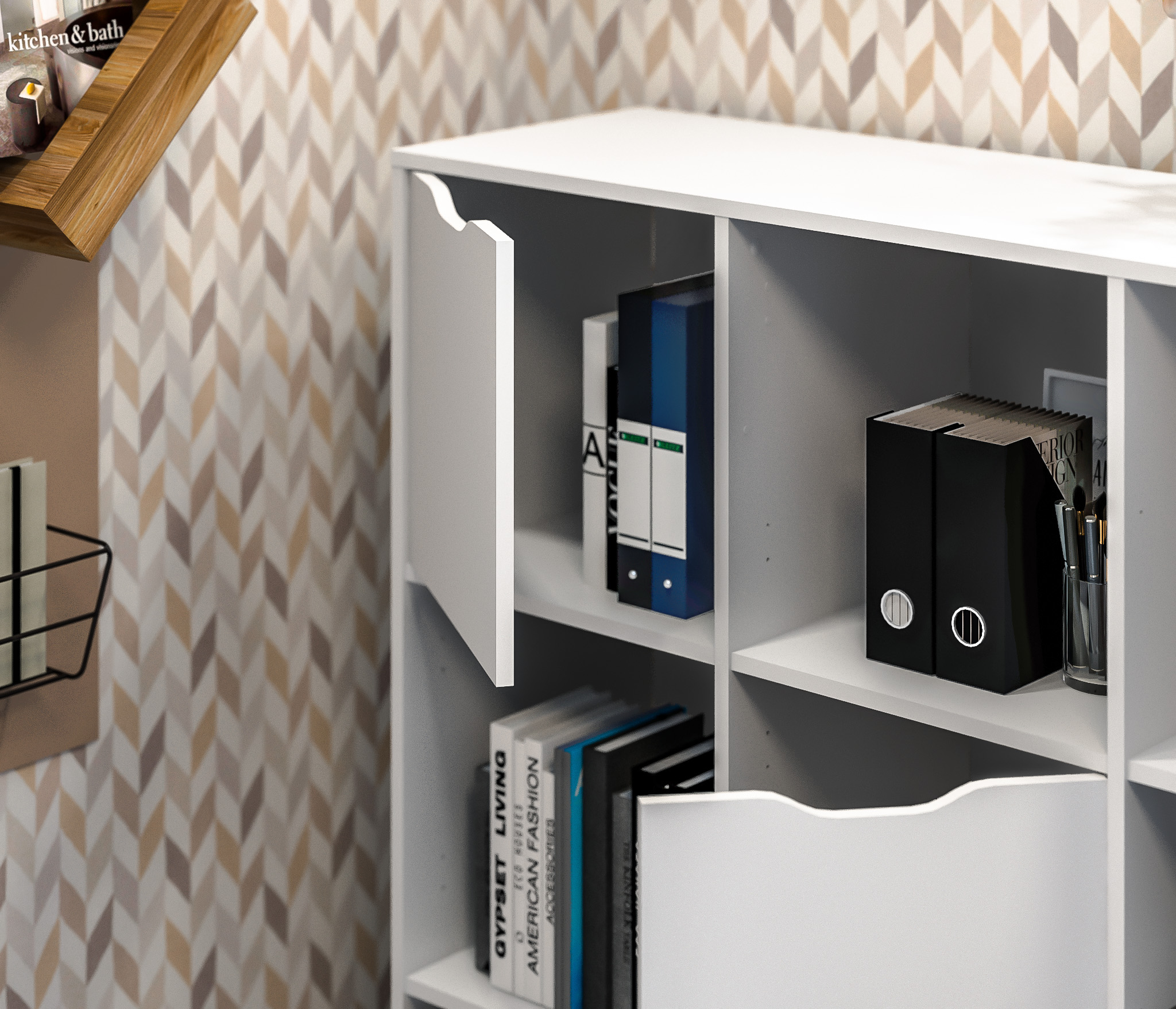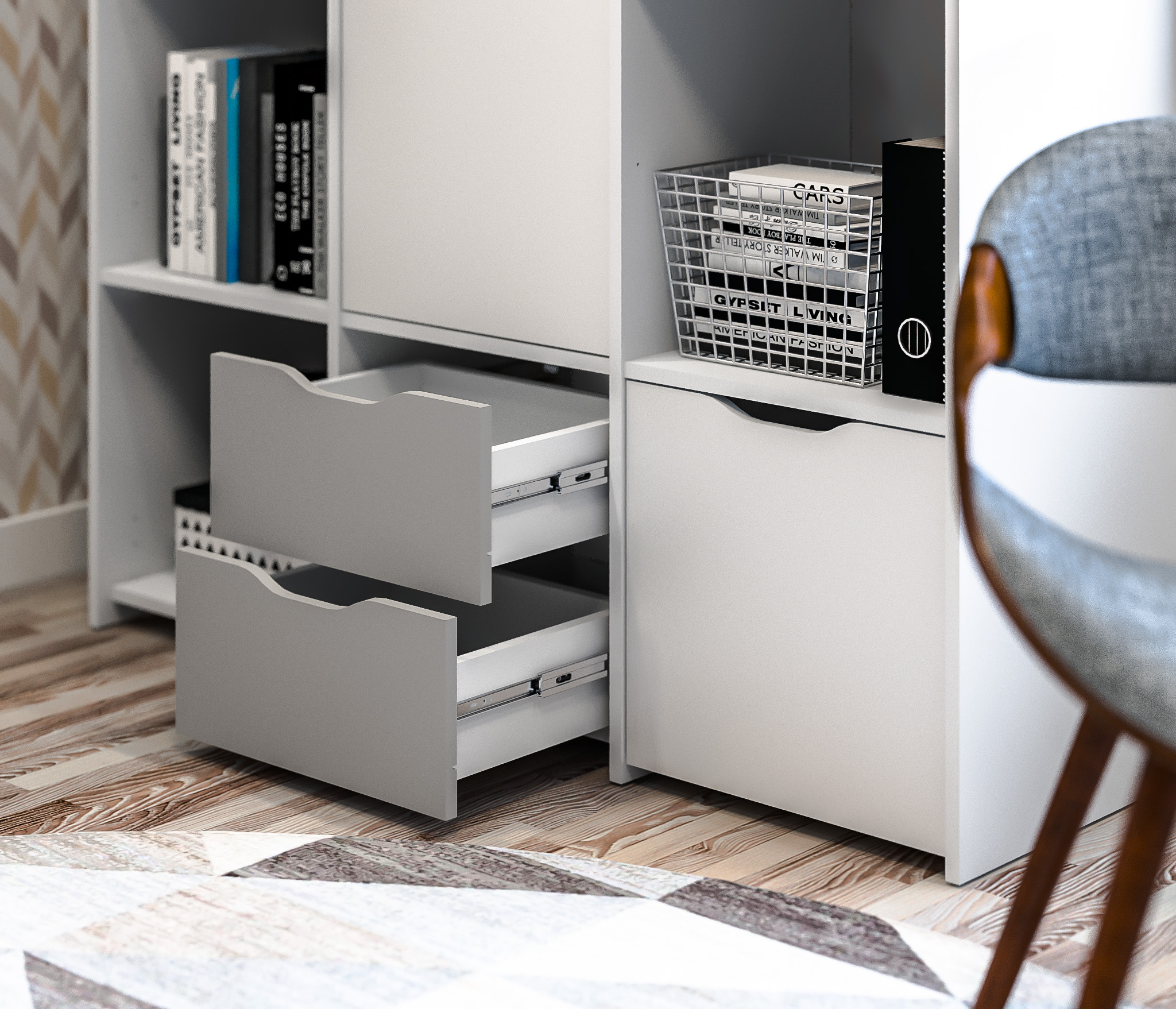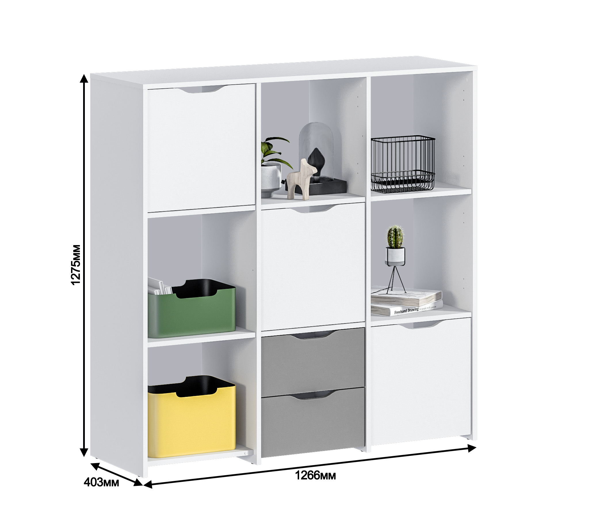 Стеллаж Mika / Мика СБ-3278 – оптимальное решение вопроса, связанного с организацией рабочего места. Стеллаж выполнен в современном минималистичном дизайне и будет уместен в офисе, кабинете, в детской и в комнате подростка. Габаритные размеры – ширина 126 см, высота 127 см и глубина 40 см. Стеллаж состоит из пяти открытых полок, трех закрытых секций и секции с двумя выдвижными вместительными ящиками. Это удобное и продуманное место хранения документов, книг, учебников, канцелярских предметов и небольшой оргтехники. Выполнен стеллаж из ЛДСП с отделкой в цветах «Белый Альпийский» и «Серый перламутровый». Стеллаж стоит дополнить элементами модульного гарнитура Мика.