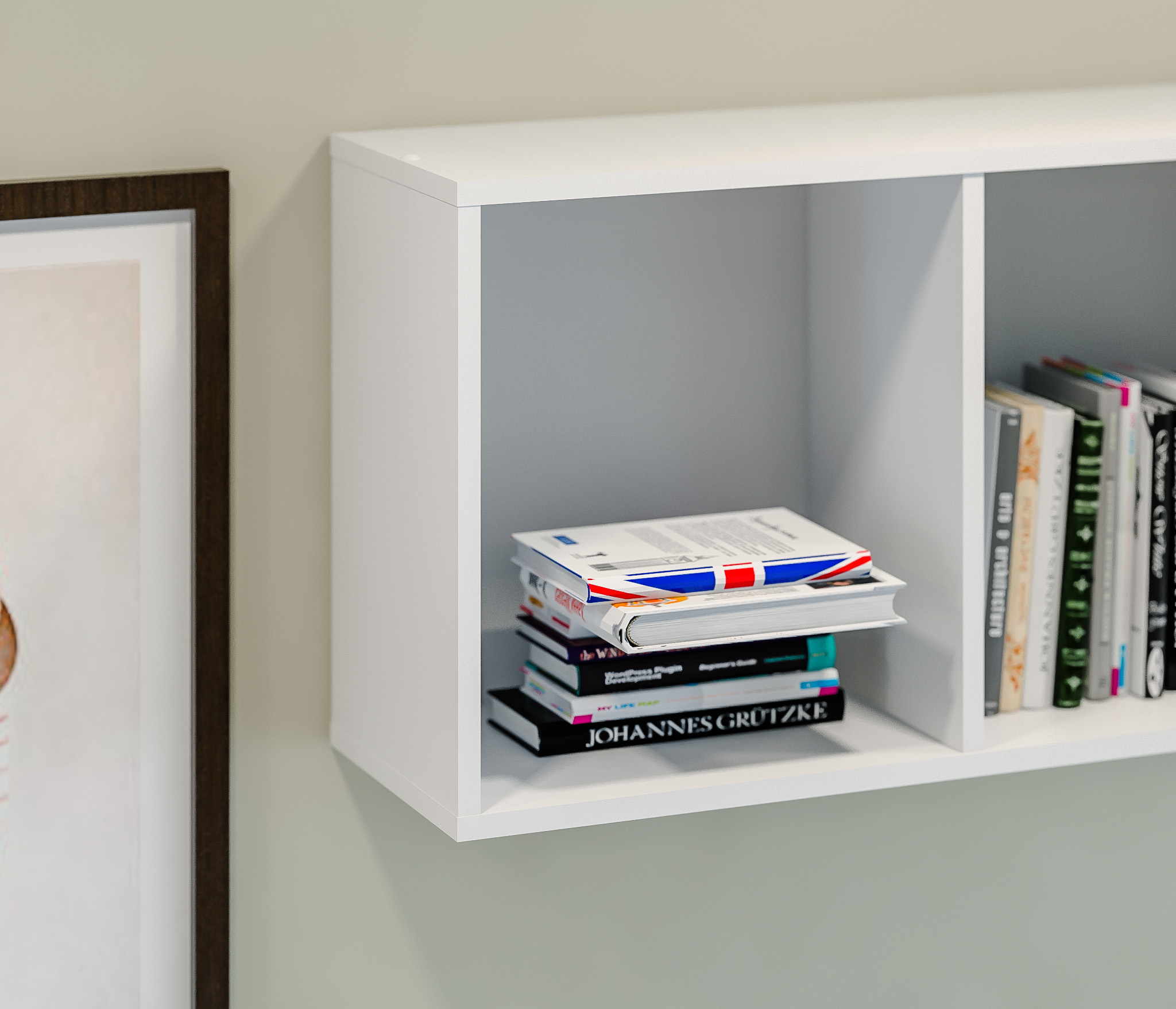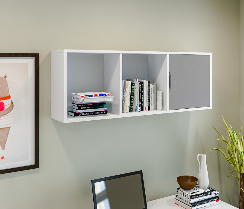 Полка Mika / Мика СБ-3279 – компактное место хранения книг, журналов, канцелярских принадлежностей или аудио, видео гарнитуры. Это навесная полка, которая является элементом модульной коллекции Мика и будет идеальным дополнением к столу из этой коллекции. Габаритные размеры – ширина 119 см, высота 35 см и глубина 24 см. Полка имеет три секции – две открытых и одну с дверцей. Материал корпуса – ЛДСП с отделкой в цвете «Белый Альпийский». Фасадная поверхность также из ЛДСП с отделкой в цвете «Серый перламутровый». Полка крепится к стене при помощи дюбелей, которые входят в комплект.