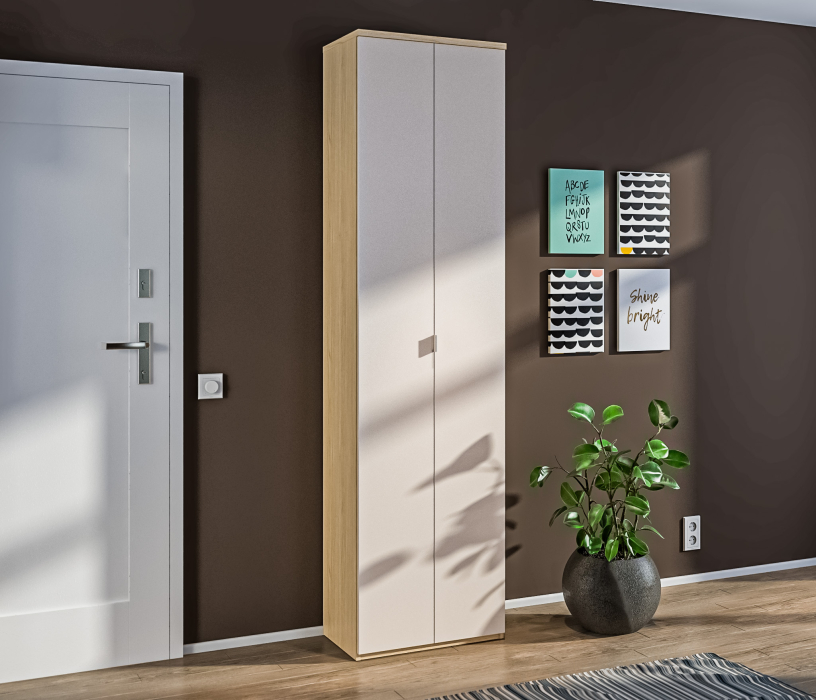 Шкаф имеет два глухих фасада, цвета кашемир серый и аккуратную торцевую ручку для комфортного открывания. Внутри расположены две вместительные полки и штанга для одежды.