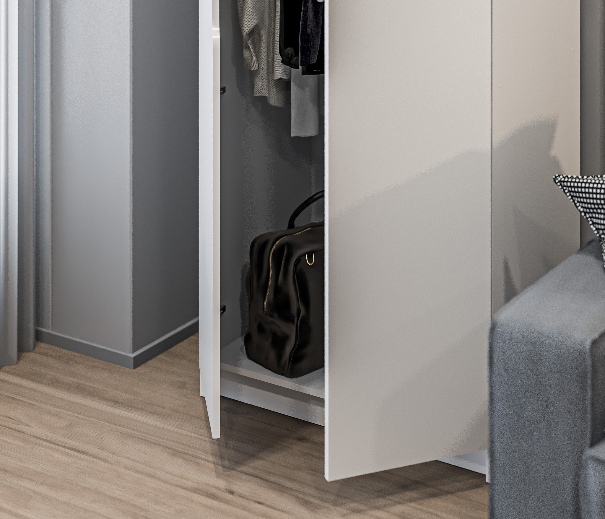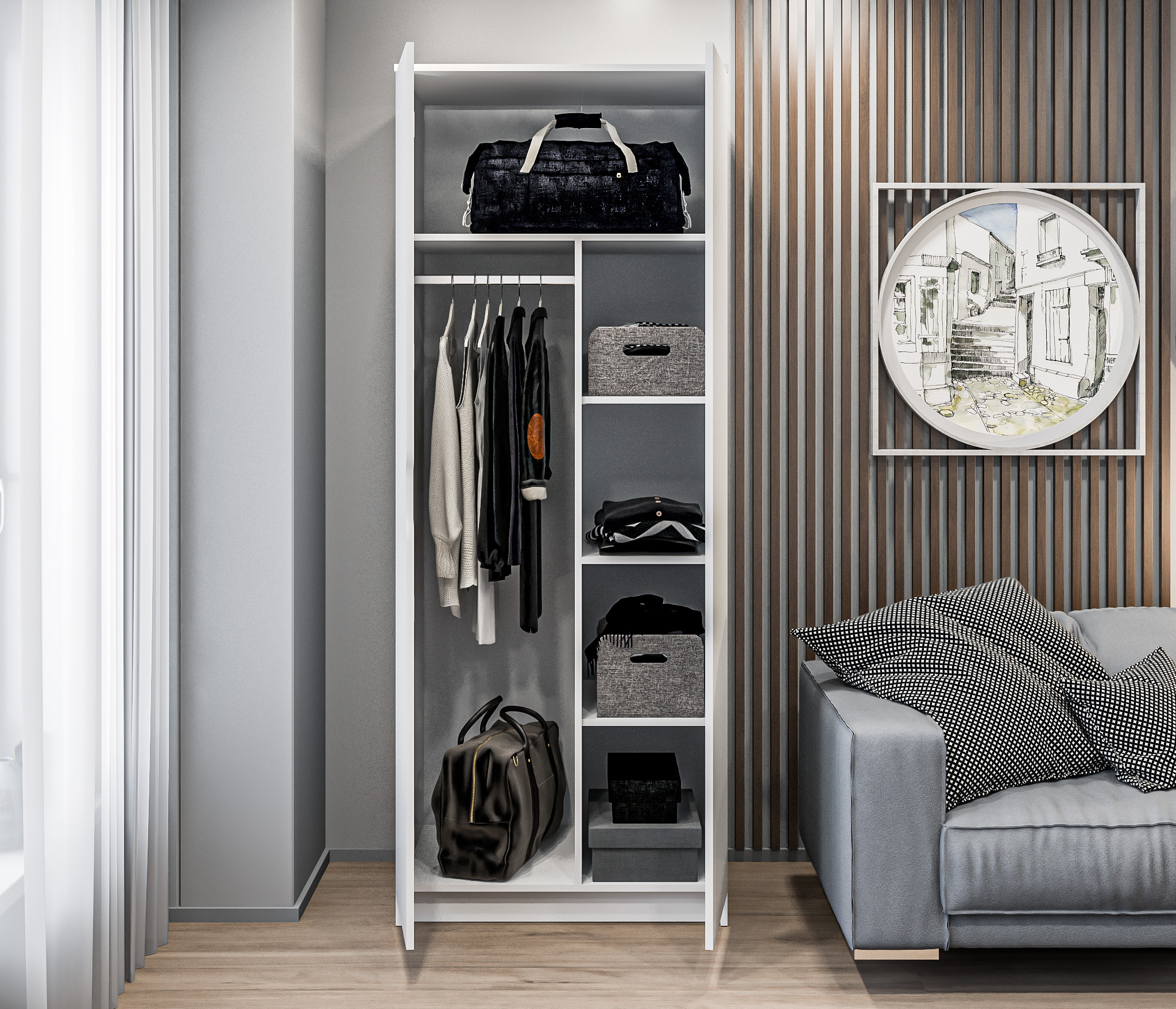 Белый цвет шкафа добавляет светлую и свежую атмосферу в комнату. Он легко сочетается с другими элементами интерьера и создает ощущение простора.