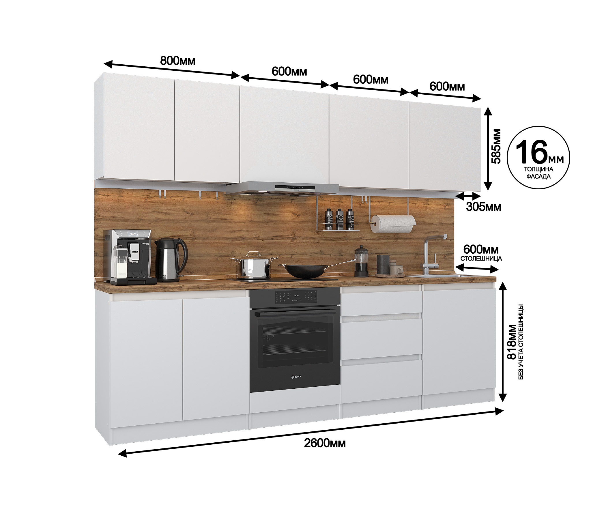 Длина кухни 2,6 метра она идеально подходит для помещений с ограниченным пространством.