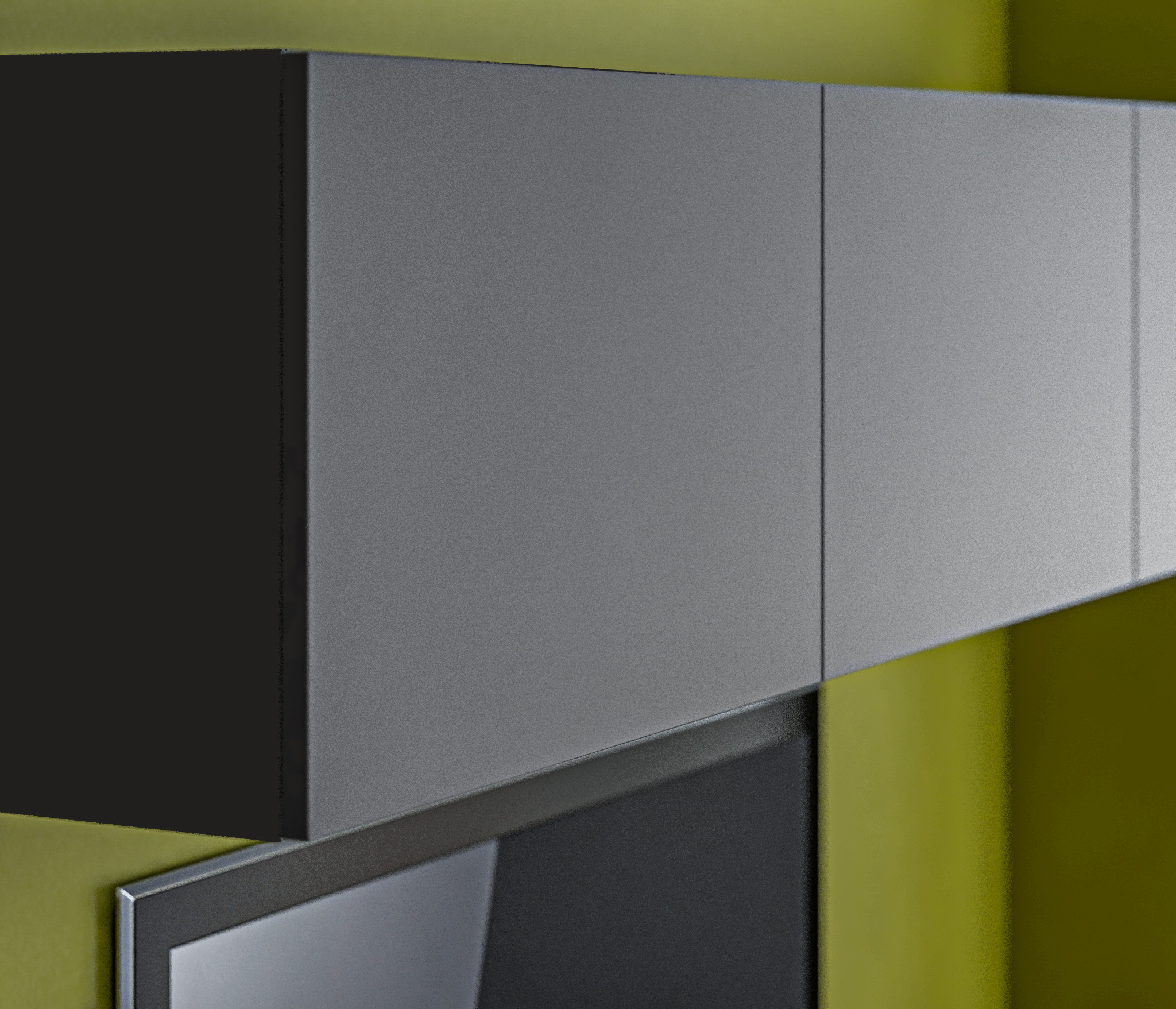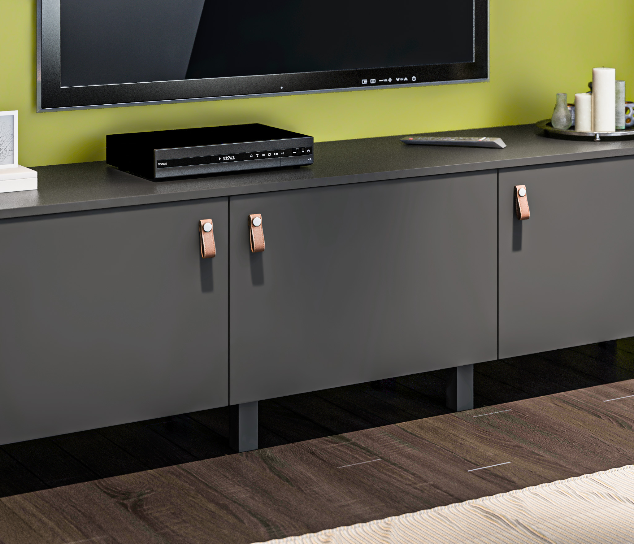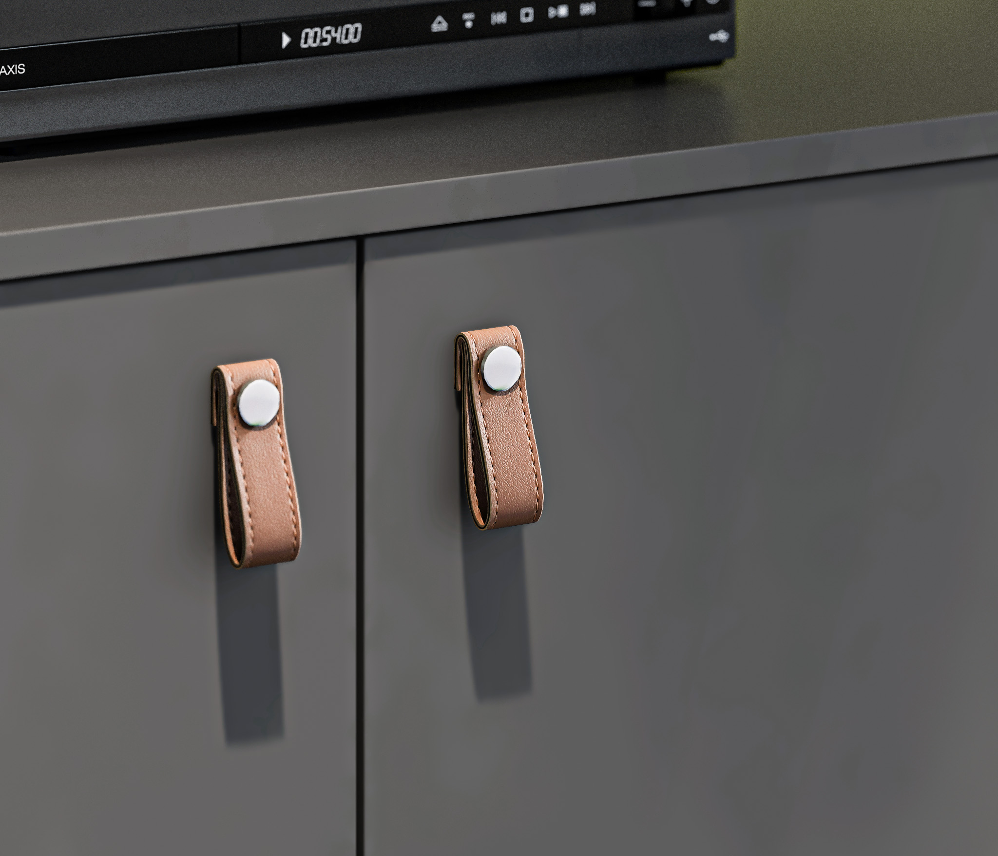 Выбор ручек является дополнительной опцией. В данной гостиной представлена ручка-кнопка в цвете хром/капучино для тумбы под телевизор, верхняя полка оснащена механизмом Push To Open, который позволяет открывать ее легким нажатием.