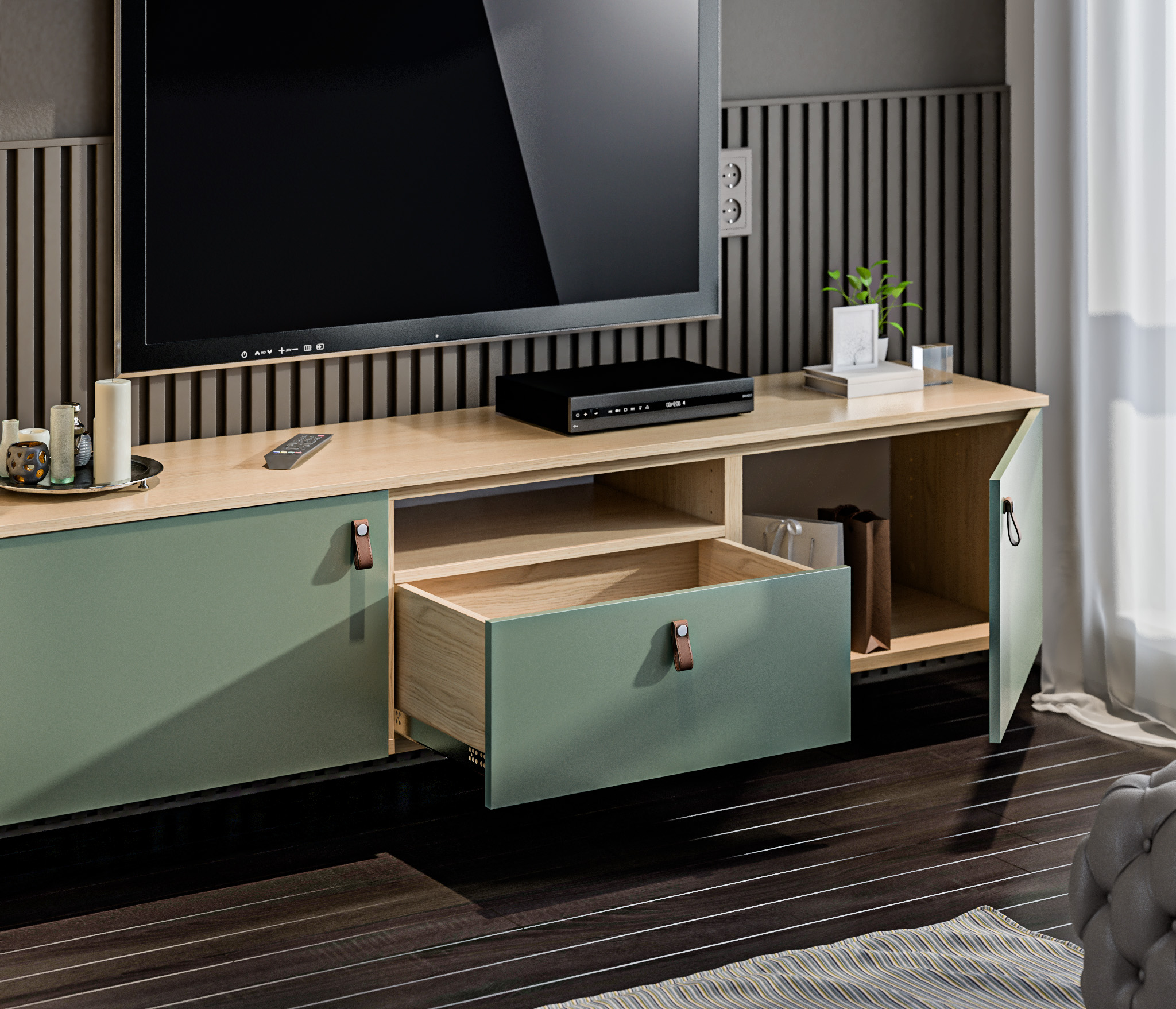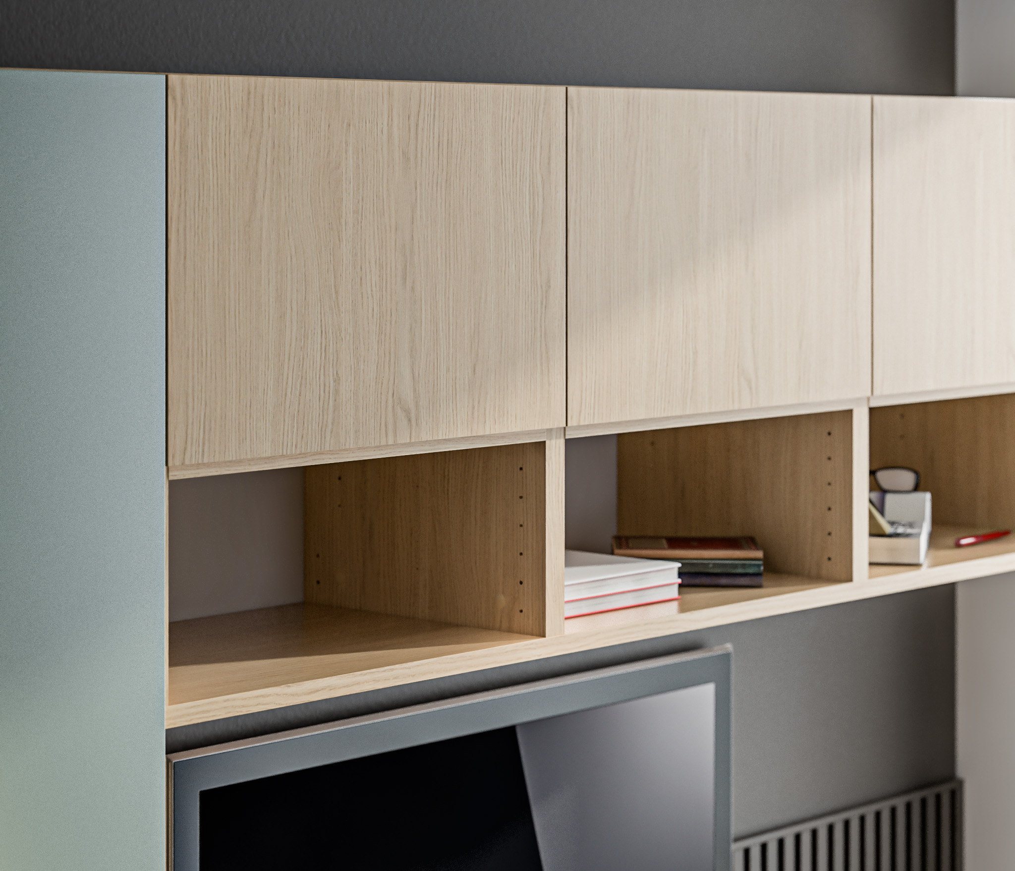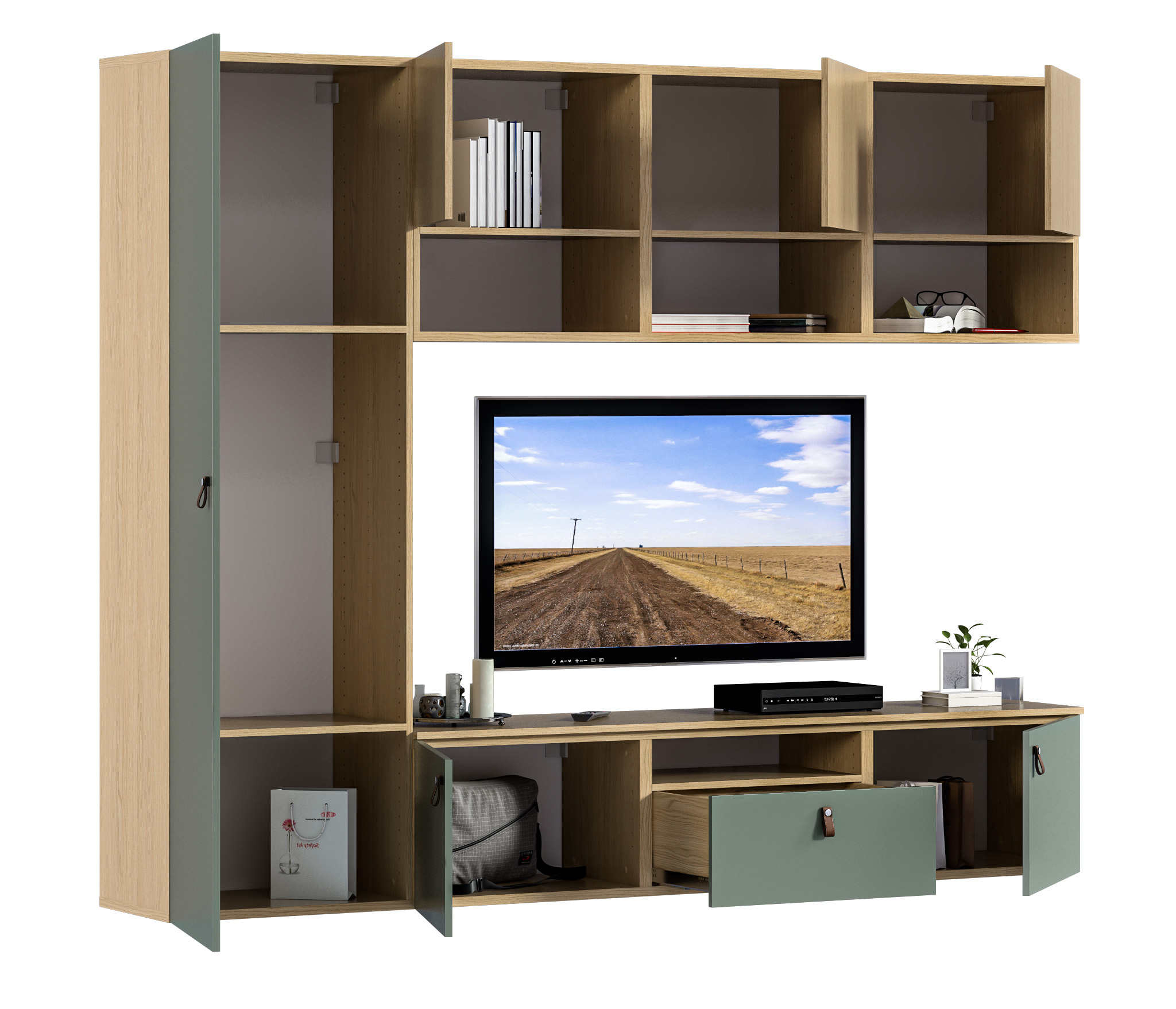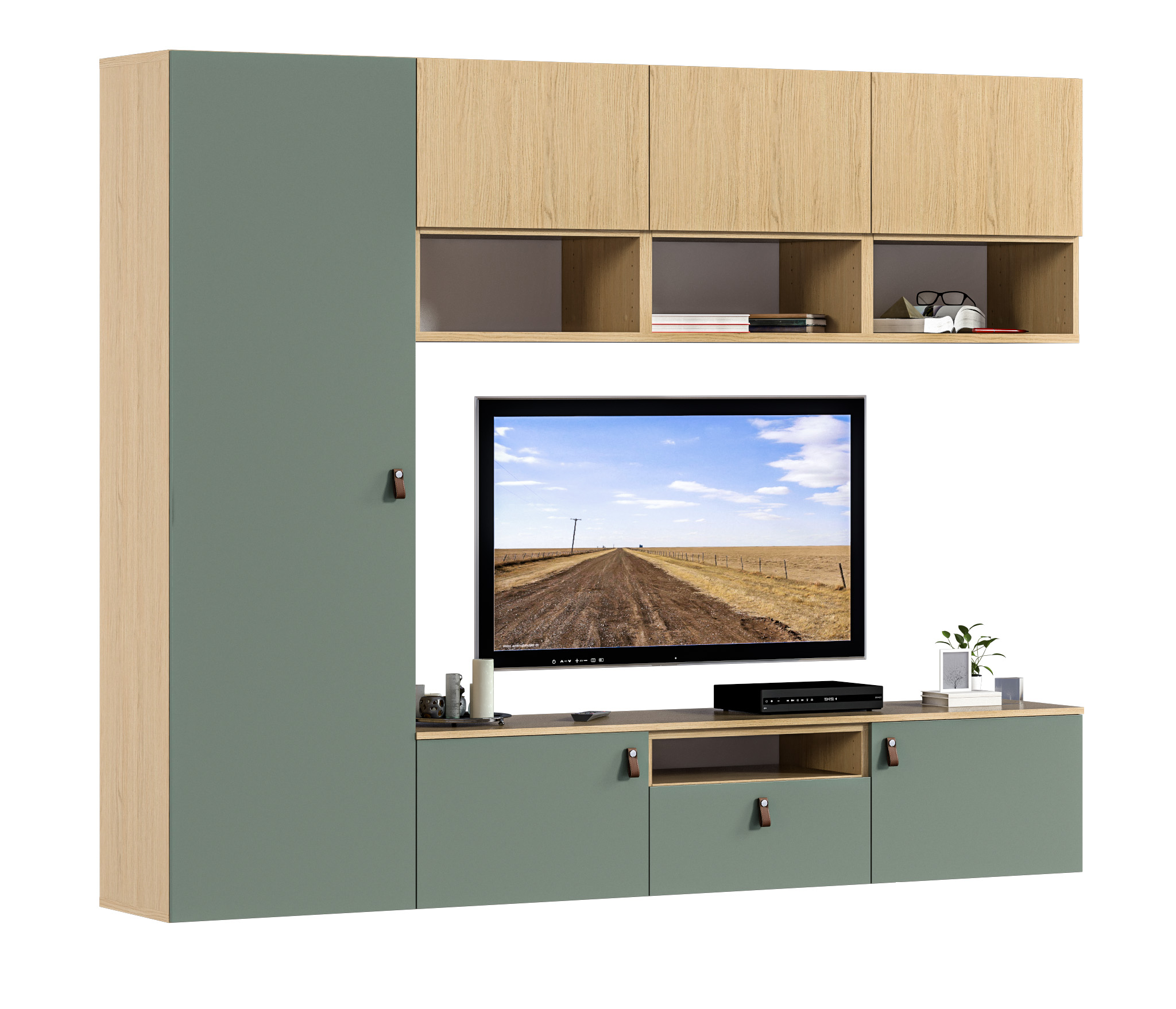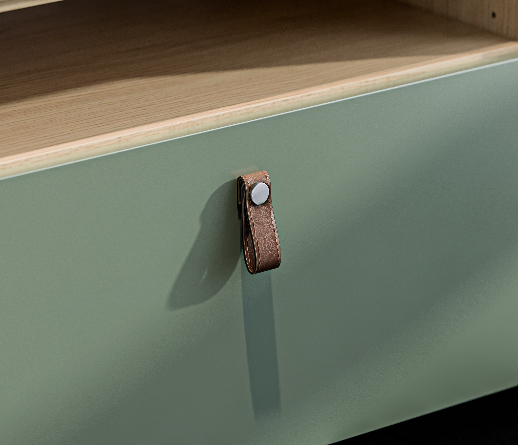 Выбор ручек является дополнительной опцией. В данной гостиной представлена ручка-кнопка в цвете хром/капучино для тумбы под телевизор и пенала, а верхняя полка оснащена механизмом Push To Open, который позволяет открывать ее легким нажатием.